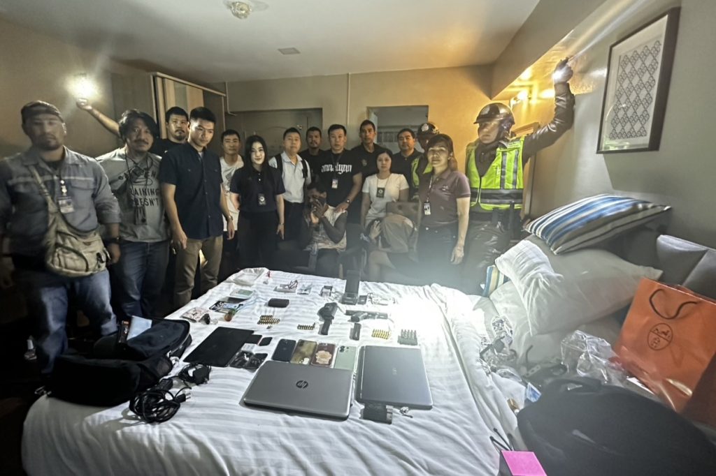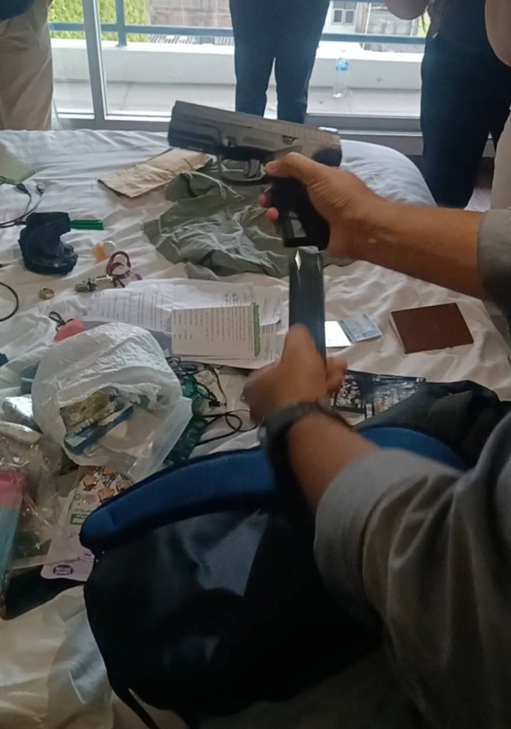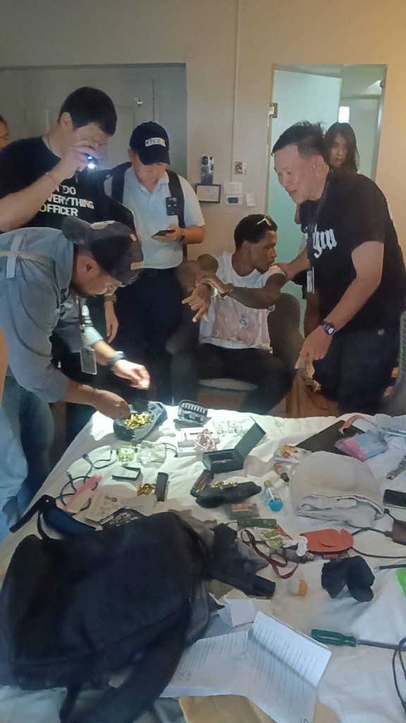 วันที่ 30 กันยายน 2568 เจ้าหน้าที่ชุดจับกุมประกอบด้วย พ.ต.ท.สุริยะ พ่วงสมบัติ รอง ผกก.สืบสวน บก.ตม.1 พ.ต.ท.ทวีทรัพย์ ชัยภูมิ, พ.ต.ท.ธงไทย ไพเราะ สว.กก.สืบสวน บก.ตม.1 นายอนุสวัสดิ์ ศุขสวัสดิ ณ อยุธยา ,น.ส.พิชญา มณีนิล ,น.ส.สุธินี เตชาวงศ์ เจ้าพนักงาน ป.ป.ส. จึงได้วางแผนสนธิกำลังในการดำเนินการตามกฎหมายกับ นายเอมมานูเอลฯ โดยนำกำลังลงพื้นที่ วางกำลังสังเกตุการรอบโรงแรม จนกระทั่งเวลาประมาณ ๑๗.๓๐ น. จึงพบคนต่างด้าวรูปพรรณสัณฐานตรงกับ นายเอมมานูเอลฯ เดินอยู่ริมถนนเพชรบุรี ห่างจากที่โรงแรมที่พักประมาณ 50 เมตร เจ้าหน้าที่ชุดจับกุมจึงได้แสดงตนเป็นเจ้าพนักงานตามกฎหมายพร้อมทั้งแสดงบัตรประจำตัวให้ดู สอบถามชื่อเพื่อยืนยันตัวตน ซึ่งในเบื้องต้นนั้น นายเอมมานูเอลฯ ซึ่งสามารถพูดภาษาไทยได้คล่องแคล่ว รับแต่โดยดีว่าตนเองคือคนเดียวกับบุคคลตามหมายจับตำรวจสากลดังกล่าวจริง และอยู่ในราชอาณาจักรโดยการอนุญาตสิ้นสุด โดยอยู่ในเมืองไทยมาตั้งแต่ปี 2559 เจ้าหน้าที่สอบถามว่ายังคงมีพฤติกรรมเกี่ยวข้องกับยาเสพติดหรือไม่ แต่เจ้าตัวกลับปฏิเสธเสียงแข็ง เจ้าหน้าที่ไม่ปักใจเชื่อ จึงขยายผลเข้าตรวจสอบภายในห้องพักของนายเอมมานูเอลฯ โดยความบริสุทธิ์ใจของนายเอมมานูเอลฯ และได้แจ้งให้ผู้จัดการโรงแรมทราบถึงเหตุแห่งการตรวจค้น เมื่อนายเอมมานูเอลฯ ใช้คีย์การ์ดแตะเข้าไปในห้อง เจ้าหน้าที่พบอุปกรณ์เสพยาทันทีบริเวณชั้นวางทีวี จึงได้ควบคุมตัวนายเอมมานูเอลฯ ให้อยู่ในความสงบ และลงมือตรวจค้นโดยละเอียดทีละจุดต่อหน้า นายเอมมานูเอลฯ และพยานผู้ดูแลโรงแรมผลการตรวจค้นเจ้าหน้าที่พบ อาวุธปืนพกสั้นขนาด 9 มม. จำนวน 1 กระบอก มีเลขทะเบียนซ่อนอยู่ในซองหนังพกใน พบปืนแบลงค์กันดัดแปลงลำกล้อง พร้อมชุดลั่นไกมีเข็มแทงชนวน อีก 2 กระบอกพร้อมแม็กกาซีนดัดแปลงสำหรับเครื่องกระสุนขนาด .38 ซ่อนอยู่ในกล่องเครื่องมือ พร้อมเครื่องกระสุนปืนขนาด 9 มม., ขนาด 11 มม. และขนาด .22 นิ้ว รวมเกือบ 80 นัด โดยมีทั้งที่บรรจุในแม็กกาซีนขึ้นลำพร้อมใช้ และซุกซ่อนตามจุดต่างๆในห้องพัก นอกจากนี้ในกระเป๋าและถุงต่างๆที่อยู่ภายในห้องเจ้าหน้าที่ยังพบ เมทแอมเฟตามีน (ยาไอซ์) น้ำหนัก 2 กรัมเศษ ยาอีหรือ ๓,๔ เมทิลีนไดออกซีเมทแอมเฟตามีนจำนวน 1 ซอง น้ำหนัก 1 กรัม เมทแอมเฟตามีนสีเขียวมิ้นอีกจำนวน 1 เม็ด