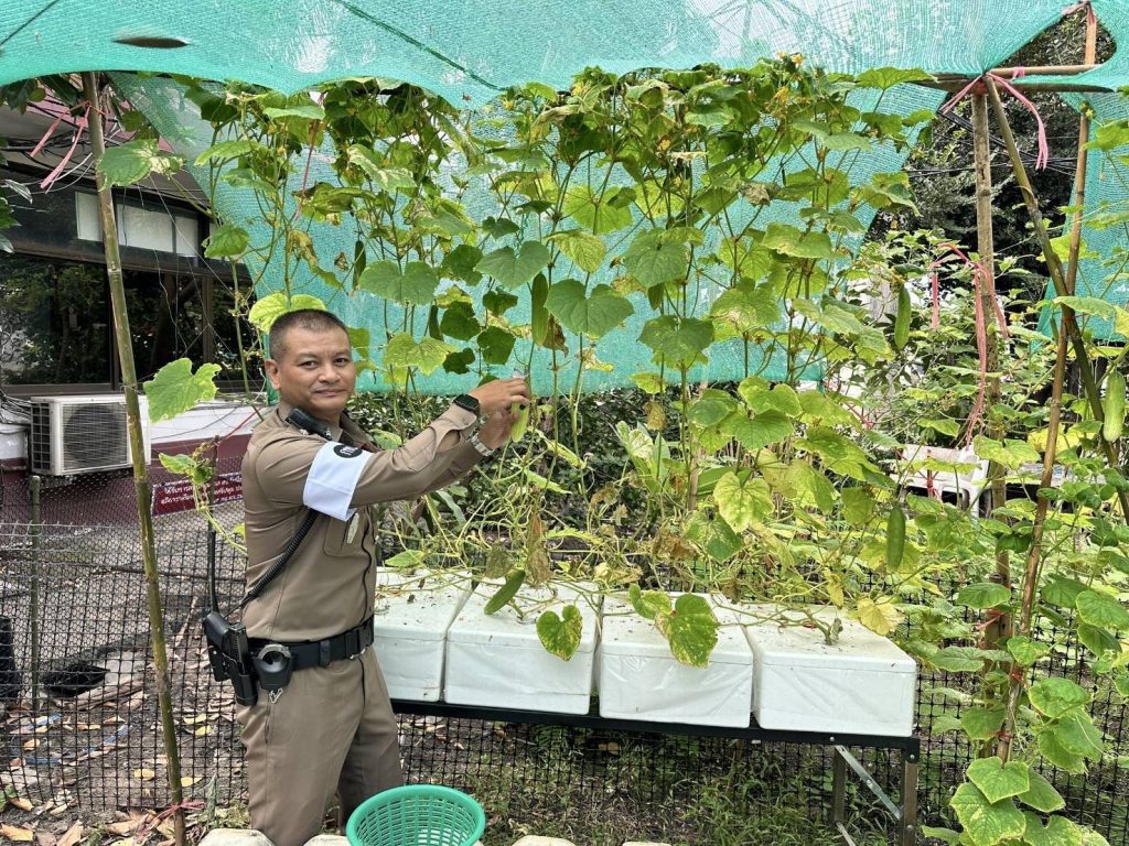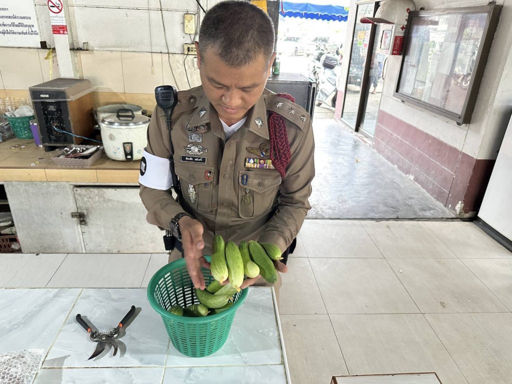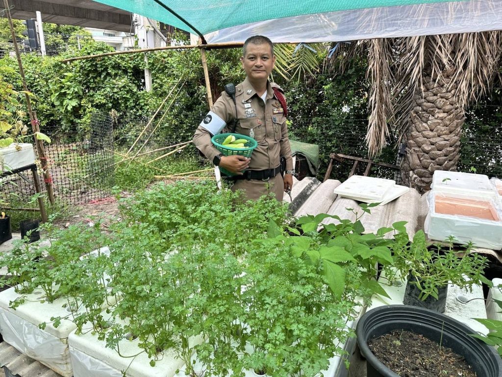 ร.ต.อ.รัตนชัย สลับศรี รองสวป.สน.บางเขน ช่วยงาน จราจร. ผู้ดูแลแปลงผัก ระบุว่า ทางงานจราจร สน.บางเขนได้ร่วมกับสน.บางเขน ดำเนินการปลูกพืชผักสวนครัว เลี้ยงกบ เลี้ยงไก่และหอย บริเวณศูนย์ควบคุมจราจร วงเวียนบางเขน ถนนพหลโยธิน ซึ่งมีการดัดแปลงปรับปรุงพื้นที่ว่างเปล่าบริเวณด้านหลังป้อมจราจรให้เป็นสถานที่ใช้ปลูกผักและเลี้ยงกบ ซึ่งเลี้ยงมานานกว่า 2 เดือนแล้ว วันนี้จึงได้ตัดเก็บผักชี และแตงกวา นำมาปรุงอาหารในสายงานจราจร บางส่วนก็แบ่งให้กับฝ่ายอื่นๆ ส่วนรากผักชีก็นำไปเพาะปลูกให้แตกยอดขึ้นใหม่อีกครั้ง