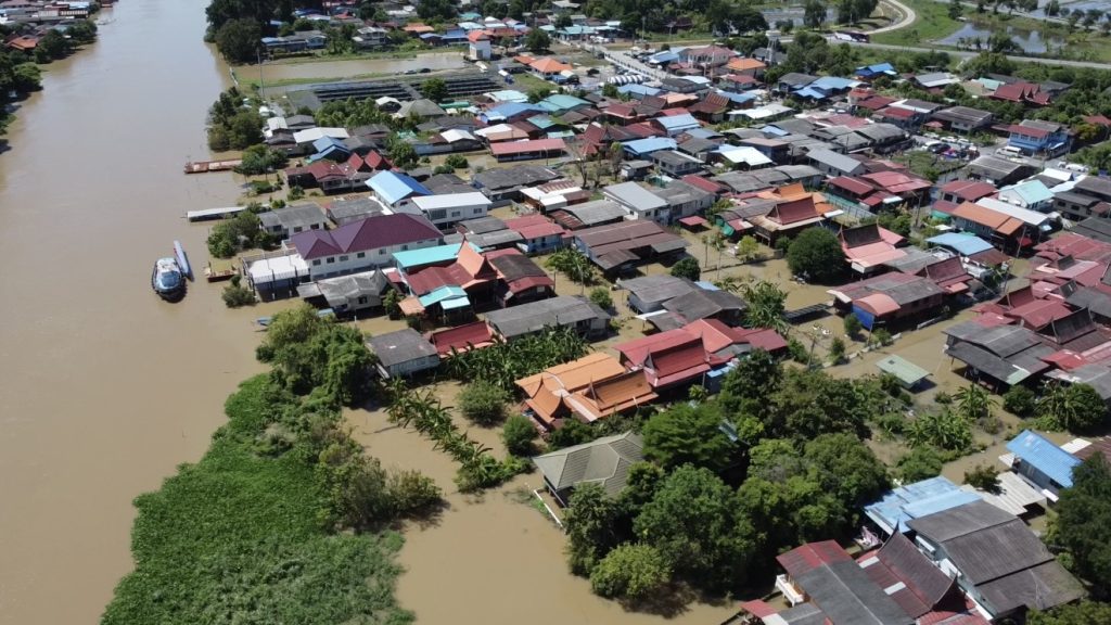 ที่ชุมชนบ้านตลาดเรียบใต้ ในพื้นที่ หมู่ที่ 4 ตำบลตลาดเกรียบ อำเภอบางปะอิน จังหวัดพระนครศรีอยุธยา ซึ่งอยู่ติดกับแม่น้ำเจ้าพระยา พบว่าน้ำในแม่น้ำเจ้าพรยาไหลเชียวแรง ระดับน้ำได้ล้นตลิ่งเข้าท่วม บ้านเรือนประชาชนบางหลังคาเรือนเป็นบ้าน 2 ชั้นน้ำท่วมพื้นที่ของชั้นล่าง บางหลังเป็นบ้านใต้ถุนสูง บ้านบางหลังต้องวางแนวกระสอบทรายไม่ให้น้ำไหลเข้าท่วมบ้านตามระดับของน้ำขึ้นน้ำลง พร้อมกับติดตั้งสูบน้ำ ถนนทางเข้าชุมชนถูกน้ำท่วมบางจุดต้องใช้เรือ และเดินลุยน้ำเข้าออก