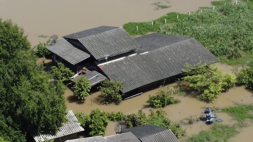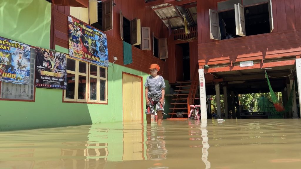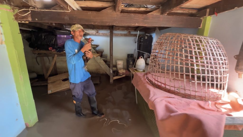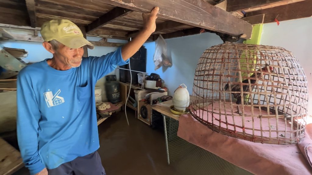 บ้านของของ นาย จาง อายุ 59 ปี ชาวบ้าน ที่ถูกน้ำท่วมใต้ถุนบ้านต้องหาโต๊ะและเก้าอี้มาตั้งหนุนเพื่อนำไก่ชนที่เลี้ยงเอาไว้มาอยู่หนีน้ำท่วม ส่วนภายในห้องนอนถูกน้ำท่วม