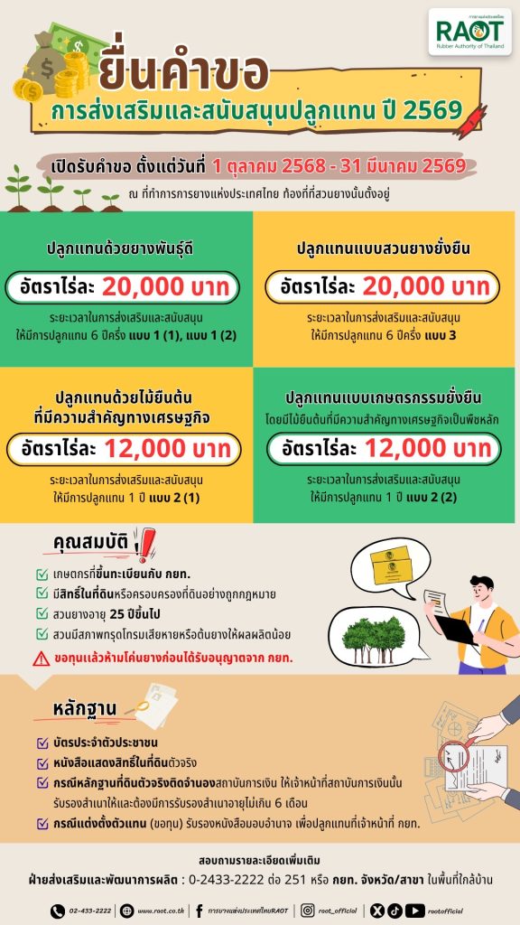 การยางแห่งประเทศไทย (กยท.) เปิดรับคำขอการส่งเสริมและสนับสนุนการปลูกแทน ประจำปี 2569 ตั้งแต่วันที่ 1 ตุลาคม 2568 – 31 มีนาคม 2569 เพื่อให้ทุนช่วยเหลือและสนับสนุนเกษตรกรชาวสวนยางที่มีสวนยางอายุมาก ทรุดโทรม เสียหาย ให้ผลผลิตน้อย เป็นการยกระดับคุณภาพชีวิต อยู่ได้ พอใจ ยั่งยืน