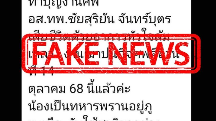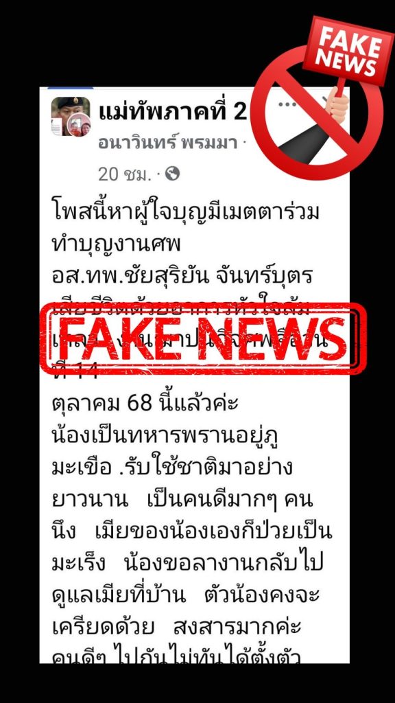เมื่อวันที่ 13 ต.ค.68 พล.ท.บุญสิน พาดกลาง อดีตแม่ทัพภาคที่ 2 เปิดเผยว่า มีผู้ใช้เพจแม่ทัพภาคที่ 2 และมีรูปตนอยู่ด้วยนั้น โดยข้อความ ระบุว่าโพสต์นี้ หาผู้ใจบุญมีเมตตา ร่วมทำบุญงานศพ อส.ทพ. นายหนึ่ง ตนขอยืนยันว่าเพจดังกล่าวเป็นเพจปลอม เป็น พวก มิจฉาชีพหลอกลวงต้มตุ๋นเอาเงินประชาชนผู้ใจบุญ