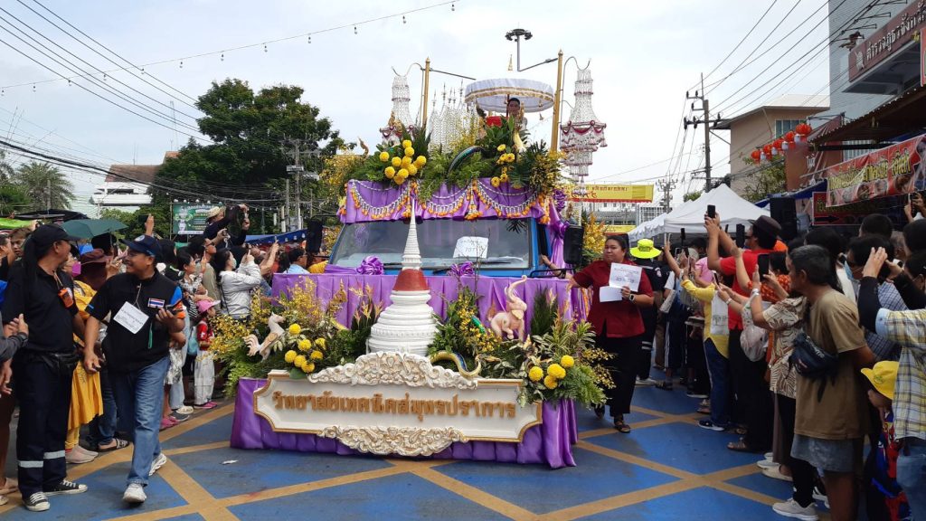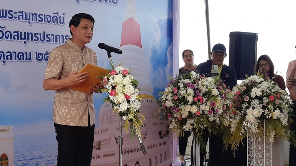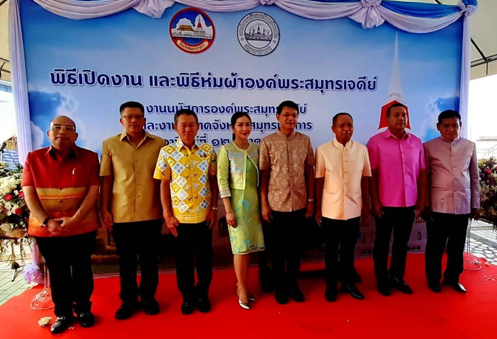 นายสยาม ศิริมงคล ผวจ.สมุทรปราการ ประธานพิธีเปิดงานนมัสการองค์พระสมุทรเจดีย์และงานกาชาดฯ โดยในช่วงเช้าประกอบพิธีสงฆ์เจริญพระพุทธมนต์ พร้อมกล่าวเปิดงานฯ ขบวนรถบุปผชาติ อัญเชิญผ้าห่มองค์พระสมุทรเจดีย์เคลื่อนขบวน ซึ่งประกอบด้วยกระบวนริ้วธง ขบวนรถบุปผชาติ ขบวนจากสถานศึกษาต่างๆ ขบวนส่งเสริมวัฒนธรรมท้องถิ่น และขบวนด้านวัฒนธรรมฯ