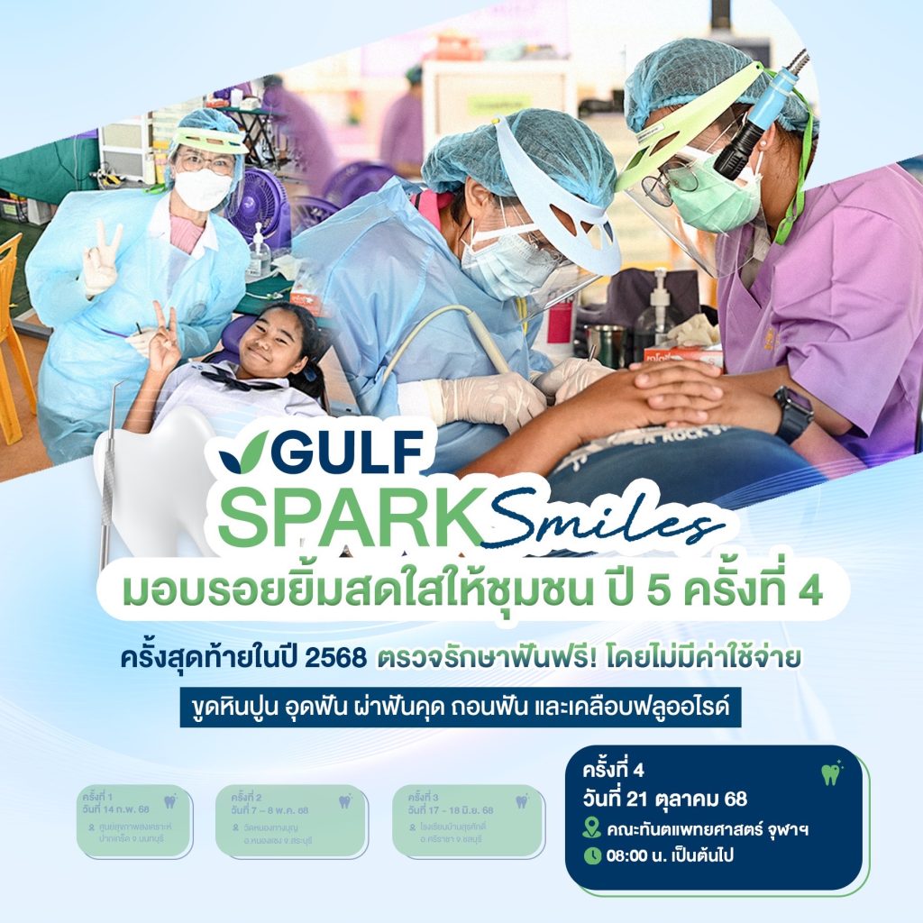 บริษัท กัลฟ์ ดีเวลลอปเมนท์ จำกัด (มหาชน) หรือ GULF ร่วมกับ คณะทันตแพทยศาสตร์ จุฬาลงกรณ์มหาวิทยาลัย เดินหน้าสานต่อเจตนารมณ์ในการส่งเสริมสุขภาพช่องปากของคนไทย จัดกิจกรรมหน่วยทันตกรรมเคลื่อนที่ “GULF Sparks Smiles มอบรอยยิ้มสดใสให้ชุมชน” ปี 5 หน่วยที่ 4 อย่างยิ่งใหญ่ เนื่องใน “วันทันตสาธารณสุขแห่งชาติ” ซึ่งตรงกับวันที่ 21 ตุลาคมของทุกปี จัดขึ้น ณ คณะทันตแพทยศาสตร์ จุฬาลงกรณ์มหาวิทยาลัย โดยเตรียมความพร้อมเพื่อรองรับประชาชนและผู้ที่ขาดโอกาสในการเข้าถึงบริการทันตกรรมได้มากถึง 1,200 คน ซึ่งนับเป็นความมุ่งมั่นของกัลฟ์ที่ต้องการยกระดับคุณภาพชีวิตและมอบโอกาสในการมีสุขภาพช่องปากที่ดีอย่างเท่าเทียมและทั่วถึง นอกจากนี้ยังเป็นพื้นที่เรียนรู้นอกห้องเรียนให้กับเยาวชนที่สนใจในอาชีพทันตแพทย์อีกด้วย