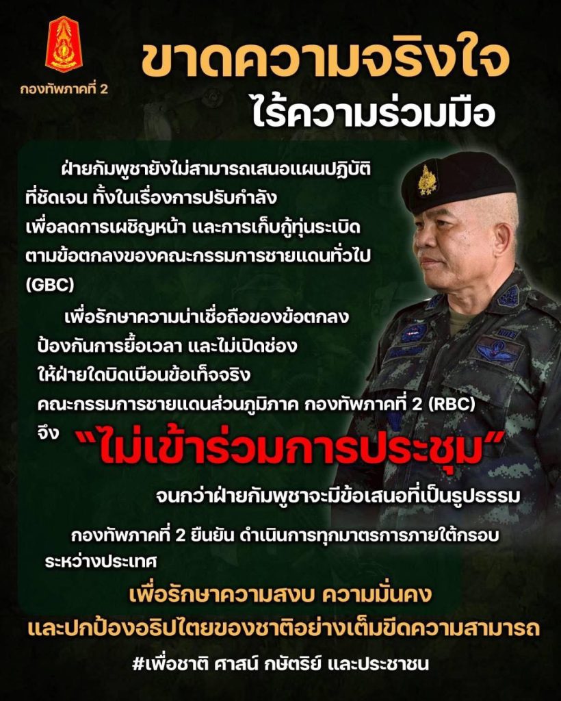 ทภ. 2 ยืนยัน กัมพูชา โดย ภูมิภาคทหารที่ 4 ไม่ร่วมมือตามเงื่อนไข จัดทำแผนการปรับกำลังและแผนเก็บกู้ทุ่นระเบิด ก็ไม่สามารถเข้าสู่ประชุม RBC ได้