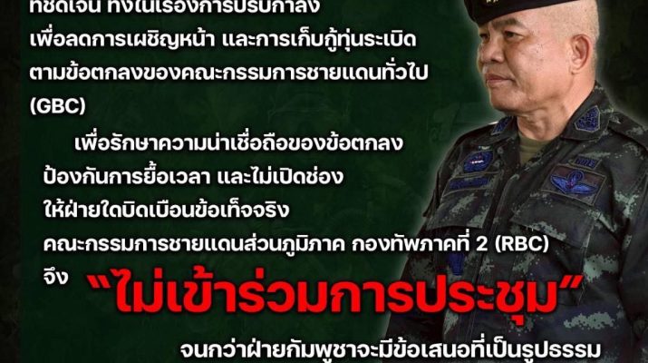 ทภ. 2 ยืนยัน กัมพูชา โดย ภูมิภาคทหารที่ 4 ไม่ร่วมมือตามเงื่อนไข จัดทำแผนการปรับกำลังและแผนเก็บกู้ทุ่นระเบิด ก็ไม่สามารถเข้าสู่ประชุม RBC ได้