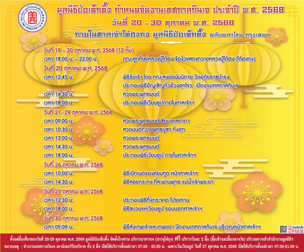 ระหว่างวันที่ 20 – 29 ตุลาคม 2568 มูลนิธิป่อเต็กตึ๊ง จัดให้มีบริการอาหารเจ [บรรจุใส่ถุง] แก่ประชาชนฟรี วันละ 2 มื้อ (มื้อเช้า และ กลางวัน) โดยเริ่มบริการตั้งแต่มื้อกลางวันของวันที่ 29 ตุลาคม ณ บริเวณทางเข้าสำนักงานมูลนิธิฯ ทั้งนี้ มูลนิธิฯ ขอความกรุณาประชาชนผู้เข้ารับบริการอาหารเจนำถุงหิ้ว/ถุงผ้ามาบรรจุอาหารด้วยทุกครั้ง