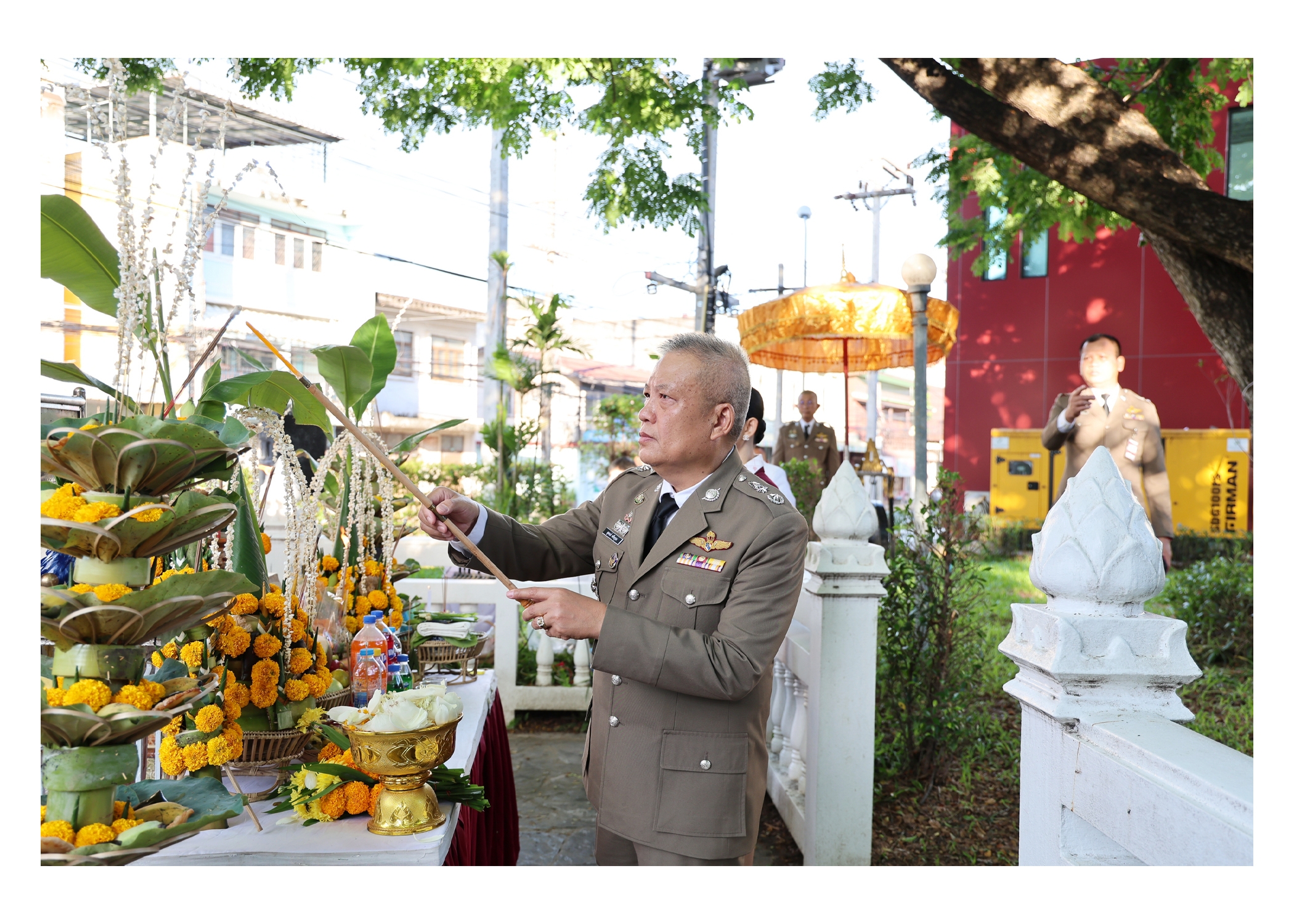 โดยมี พ.ต.อ.กิตติเชษฐ์ ศักยภาพวิชานนท์ รอง ผบก.ภ.จ.สุรินทร์, พ.ต.อ.เชษฐา เชยชุ่ม รอง ผบก.ภ.จ.สุรินทร์, พ.ต.อ.ต่อศักดิ์ ศรีเสริม รอง ผบก.ภ.จ.สุรินทร์, พ.ต.อ.อิทธิพล พงษ์ธร ผกก.กก.สืบสวนฯ, พ.ต.อ.เอกพงษ์ พลมณี ผกก.สภ.เมืองสุรินทร์, คุณอมรรัตน์ ผลประเสริฐ ประธานแม่บ้านตำรวจภูธรจังหวัดสุรินทร์, ข้าราชการตำรวจในสังกัด ภ.จว.สุรินทร์, กก.สืบสวนฯ, กลุ่มงานสอบสวนฯ, สภ.เมืองสุรินทร์, หน่วยงานในสังกัด และ คณะแม่บ้านตำรวจภูธรจังหวัดสุรินทร์ เข้าร่วมในพิธี