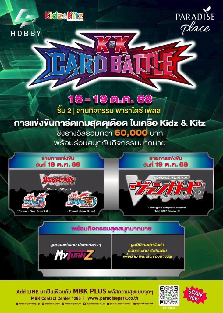 พาราไดซ์ เพลส ศูนย์การค้าในเครือเอ็ม บี เค ร่วมกับ Kidz & Kitz และ DP Hobby จัดการแข่งขันการ์ดเกมสุดมันส์ “K&K Card Battle” รวมเกมดังในเครือ Kidz & Kitz มาให้เหล่าคอเกมได้ประชันฝีมืออย่างจุใจ ไม่ว่าจะเป็นเกม Cardfight!! Vanguard D Flight, Future Card Buddyfight Over Drive 4.0, Future Card Buddyfight New Drive และ Cardfight!! Vanguard Booster Trial 2025 Season 2 ชิงรางวัลรวมกว่า 60,000 บาท
