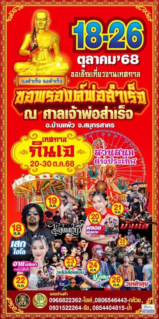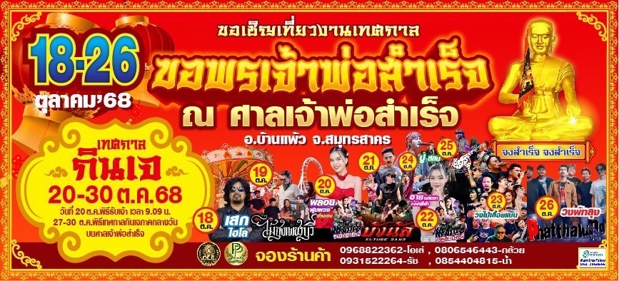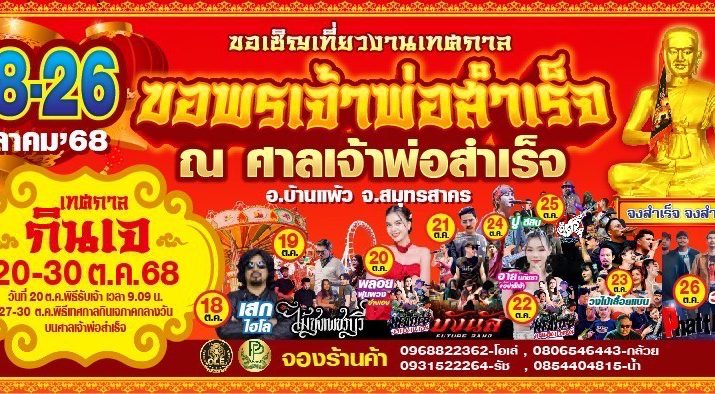 ขอเชิญเที่ยวงานเทศกาลขอพร “องค์พ่อสำเร็จ จงสำเร็จ จงสำเร็จ”ณ ศาลเจ้าพ่อสำเร็จ อำเภอบ้านแพ้ว จังหวัดสมุทรสาคร
