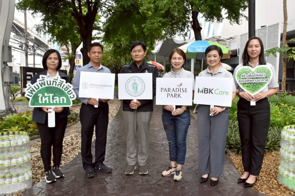 พาราไดซ์ พาร์ค ศูนย์การค้าในเครือเอ็ม บี เค สานต่อเจตนารมณ์ในการดูแลสิ่งแวดล้อมและชุมชนอย่างยั่งยืน ผ่านแนวคิด MBK Care พร้อมสนับสนุนนโยบาย “สวน 15 นาที” ของกรุงเทพมหานคร โดยร่วมกับ สำนักงานเขตประเวศ พัฒนาพื้นที่บริเวณหน้าศูนย์การค้ากว่า 1,000 ตารางเมตร ด้วยการปรับภูมิทัศน์ตกแต่งด้วยไม้พุ่มและไม้ประดับ อาทิ พวงทอง ยี่โถดอกขาว ต้อยติ่งม่วง สัปปะรดสี เล็บครุฑ กำแพงเงิน หมากผู้หมากเมีย เศรษฐีเรือนนอก เฟื้องฟ้า หูกระจง อินทนินม่วง และกาบหอย รวมถึงจัดวางเก้าอี้ เพื่อให้ประชาชนได้มาพักผ่อนและใช้ประโยชน์จากพื้นที่ได้อย่างสะดวก สบายแล้ว ทุกคนยังสามารถเข้าถึงพื้นที่สีเขียวได้ภายในระยะเดินเท้าเพียง 15 นาที หรือประมาณ 800 เมตร ตามแนวทางของ นายชัชชาติ สิทธิพันธุ์ ผู้ว่าราชการกรุงเทพมหานคร ที่มุ่งยกระดับคุณภาพชีวิตคนเมือง ลดมลพิษ ส่งเสริมชุมชนคาร์บอนต่ำ