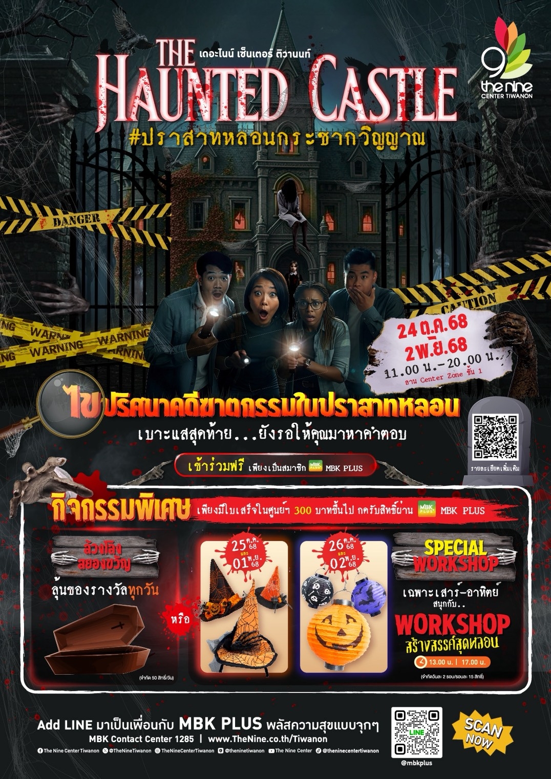 เดอะไนน์ เซ็นเตอร์ ติวานนท์ ศูนย์การค้าในเครือเอ็ม บี เค ปลุกความสยองรับฮาโลวีน ชวนคุณมาท้าพิสูจน์ทุกโสตประสาทกับงาน The Nine Center Tiwanon “THE HAUNTED CASTLE #ปราสาทหลอนกระชากวิญญาณ” พร้อมร่วมไขปริศนาคดีฆาตกรรมในปราสาทหลอน สุดสยอง ที่รอให้เข้ามาค้นหาคำตอบกันได้ฟรี เพียงแต่เป็นสมาชิก MBK PLUS
