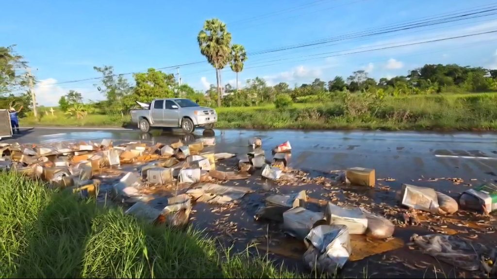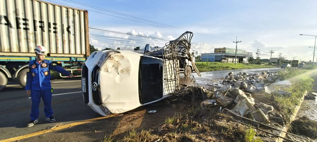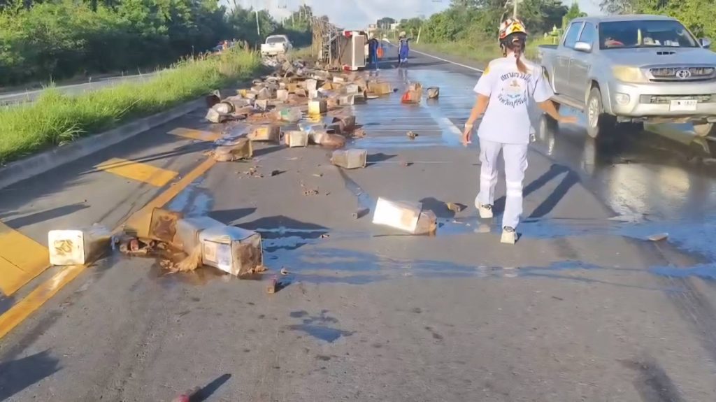 บุรีรัมย์ หอมฟุ้งกระบะบรรทุกปลาร้ายางระเบิดเสียหลักพลิกคว่ำกระจายเกลื่อนถนน