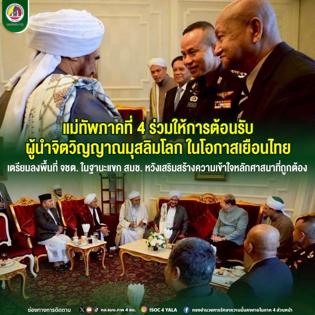 ผู้สื่อข่าวรายงาน (วานนี้) วันที่ 21 ตุลาคม 2568 ณ โรงแรมอัลมีรอช กรุงเทพมหานคร พลโท นรธิป โพยนอกแม่ทัพภาคที่ 4 /ผู้อำนวยการรักษาความมั่นคงภายในภาค 4 ร่วมให้การต้อนรับ ผู้นำศาสนาระดับโลกอิสลาม ฮาบีบ อุมัร มูฮัมหมัด ซาเล็ม บิน ฮาฟิส ผู้สืบเชื้อสาย จากท่านศาสดา นบี มูฮัมหมัดแห่งศาสนาอิสลามลำดับที่ 33 ผู้นำจิตวิญญาณของพี่น้องมุสลิมอันดับหนึ่งของโลกจากประเทศเยเมน และคณะ ในโอกาสมายืนประเทศไทย ในฐานะแขกของ สภาความมั่นคงแห่งชาติ (สมช.) โดยมี เลขาธิการสภาความมั่นคงแห่งชาติ, หัวหน้าคณะพูดคุยสันติสุขจังหวัดชายแดนภาคใต้, ผู้แทนจากกองอำนวยการรักษาความมั่นคงภายในราชอาณาจักร, ศูนย์อำนวยการบริหารจังหวัดชายแดนภาคใต้, ผู้แทนจากกระทรวงการต่างประเทศ และส่วนที่เกี่ยวข้อง ร่วมติดตามและนำคณะ ผู้นำศาสนาระดับโลกอิสลาม ฮาบีบ อุมัร มูฮัมหมัด ซาเล็ม บิน ฮาฟิส ผู้สืบเชื้อสายจากท่านศาสดา นบี มูฮัมหมัดแห่งศาสนาอิสลามลำดับที่ 33 ผู้นำจิตวิญญาณของ พี่น้องมุสลิมอันดับหนึ่งของโลกจากประเทศเยเมน
