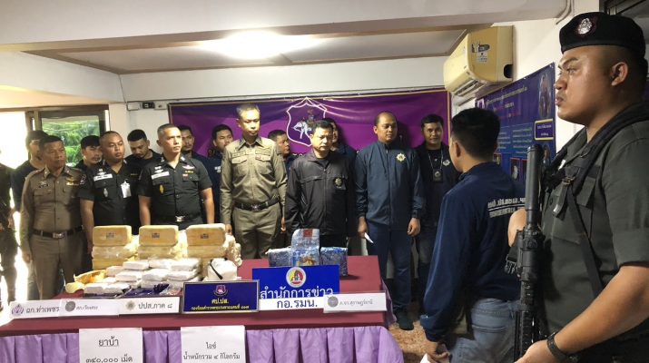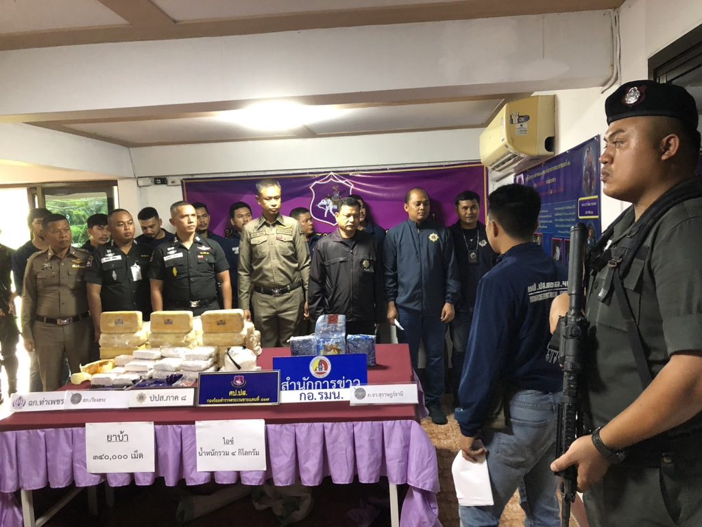 เมื่อเวลา 14.30 น.วันที่ 25 ต.ค.68 ที่ศป.ปส.ร้อย ตชด.417 อ.เมือง จ.สุราษฎร์ธานี พ.ต.อ.สมบัติ ฉ่ำแสง รอง ผบก.ภ.จว.สุราษฎร์ธานี พ.ต.อ.จาริพัฒน์ ทองแดง ผกก.ตชด.41 พ.ต.ท.เฉลิมชัย ศรีทอง ผบ.ร้อย ตชด.417 หน.ชปข. นายสวาท หึงษาชู เจ้าหน้าที่ ปปส.ภ.8 ร่วมจับกุมตัวนายจรัน หรือแดง ดีใหม่ อายุ 47 ปี อยู่บ้านเลขที่ 448 หมู่ที่ 10 ต.บ้านล้อง อ.เวียงสระ จ.สุราษฎร์ธานี และนายกิตติพงศ์ สังข์แก้ว อายุ 28 ปี อยู่บ้านเลขที่ 88/6 ม.5 ต.ที่วัง อ.ทุ่งสง จ.นครศรีธรรมราช 2 ผู้ต้องหาค้ายาเสพติด พร้อมของกลาง ยาบ้าจำนวน 3.4 แสนเม็ด ไอซ์จำนวน 4 กิโลกรัม รถยนต์ยี่ห้อฮอนด้า รุ่นชีวิค สืบรอน ทะเบียน กธ 3238 ตรัง รถกระบะ ยี่ห้อ อีซูซุ รุ่นดีแม็ก สีเทา ทะเบียน บน 6899 ภูเก็ต และรถยนต์เก๋งยี่ห้อโตโยต้า รุ่นวีออส สีดำ ทะเบียน กฉ 7873 นครศรีธรรมราช