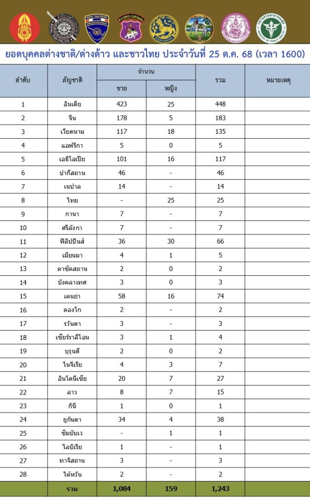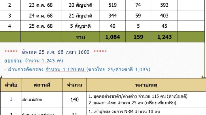เมื่อวันที่ 25 ต.ค.68 หนาวยเฉพาะกิจราชมนู กองกำลังนเรศวร (ฉก.ราชมนู กกล.นเรศวร) ได้รายงานยอดบุคคลต่างชาติ (ต่างด้าว) ร่วม 28 ประเทศ อาทิ อินเดีย จีน เวียดนาม แอฟริกา ไตยหวัน ลาว เคนยา ไนจีเรีย กินี คองโก ฟิลิปปินส์ ศรีลังกา กานา รวันด้า และชาวไทย ทีหนีตายมาจากพื้นที่โครงการเขตเศรษฐกิจพิเศษจีน เคเค ปาร์ค ( KK park) ตั้งอยู่ที่บ้านเองจีเมี่ยง พิกัดที่(MU 527384) อ.เมียวดี จ.เมียวดี รัฐกะเหรี่ยง ประเทศเมียนมา ที่หลบหนีการกวดล้างของทหารเมียนมา หนีข้ามแม่น้ำเมย ทางช่องทางธรรมชาติ และท่าข้ามฝาก ข้ามมายังฝั่งประเทศใน ในพื้นที่ อำเภอแม่สอด จังหวัดตาก ประจำวันที่ 25 ต.ค. 68 ณ เวลา 16.00 ยอดต่างด้าวที่เข้ามาในพื่นที่ฝั่งไทย จำนวน 1,243 คน แยกออกเป็น ผู้ชาย1084 คน , ผู้หญิง 159 คน