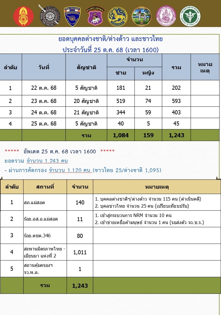 เมื่อวันที่ 25 ต.ค.68 หนาวยเฉพาะกิจราชมนู กองกำลังนเรศวร (ฉก.ราชมนู กกล.นเรศวร) ได้รายงานยอดบุคคลต่างชาติ (ต่างด้าว) ร่วม 28 ประเทศ อาทิ อินเดีย จีน เวียดนาม แอฟริกา ไตยหวัน ลาว เคนยา ไนจีเรีย กินี คองโก ฟิลิปปินส์ ศรีลังกา กานา รวันด้า และชาวไทย ทีหนีตายมาจากพื้นที่โครงการเขตเศรษฐกิจพิเศษจีน เคเค ปาร์ค ( KK park) ตั้งอยู่ที่บ้านเองจีเมี่ยง พิกัดที่(MU 527384) อ.เมียวดี จ.เมียวดี รัฐกะเหรี่ยง ประเทศเมียนมา ที่หลบหนีการกวดล้างของทหารเมียนมา หนีข้ามแม่น้ำเมย ทางช่องทางธรรมชาติ และท่าข้ามฝาก ข้ามมายังฝั่งประเทศใน ในพื้นที่ อำเภอแม่สอด จังหวัดตาก ประจำวันที่ 25 ต.ค. 68 ณ เวลา 16.00 ยอดต่างด้าวที่เข้ามาในพื่นที่ฝั่งไทย จำนวน 1,243 คน แยกออกเป็น ผู้ชาย1084 คน , ผู้หญิง 159 คน