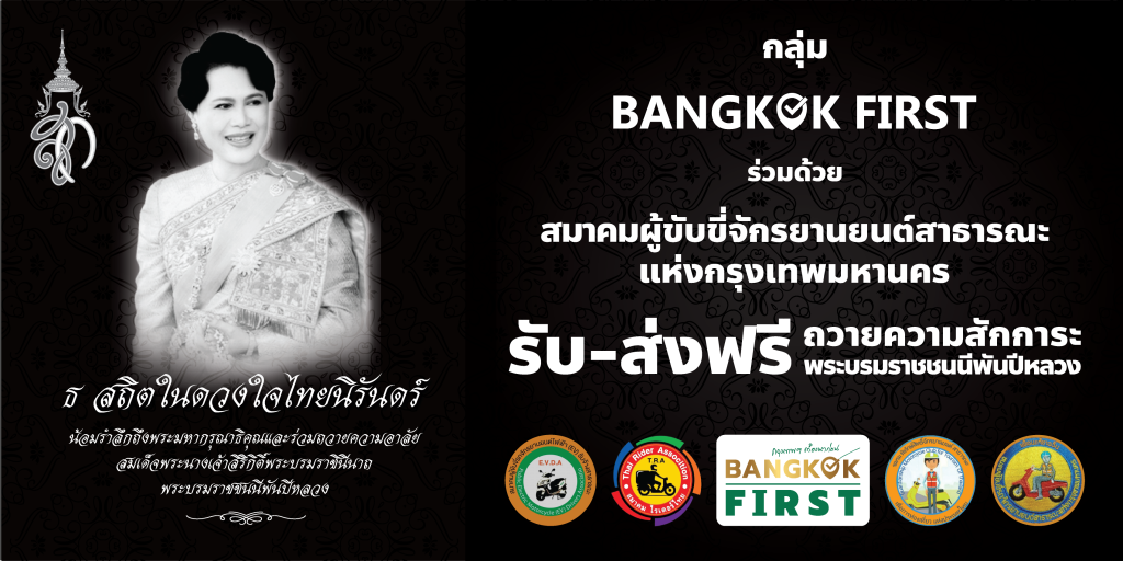 กลุ่มแบงคอกเฟิร์ส ร่วมกับ สมาคมวินจักรยานยนต์ ขอเป็นส่วนหนึ่งในการอำนวยความสะดวกแก่พี่น้องประชาชนที่ตั้งใจเดินทางไปถวายสักการะ พระบรมราชชนนีพันปีหลวง ณ พระบรมมหาราชวังและท้องสนามหลวง