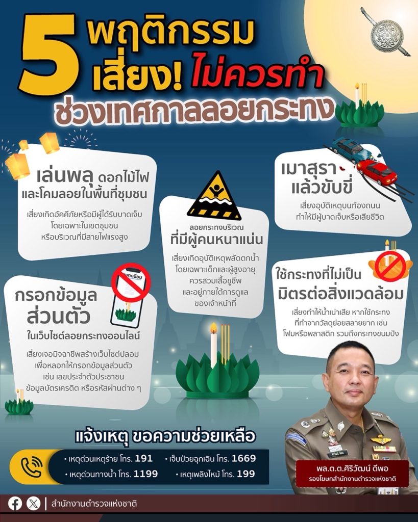 สำนักงานตำรวจแห่งชาติ แนะนำ 5 พฤติกรรมเสี่ยง ที่ไม่ควรทำช่วงเทศกาลลอยกระทง