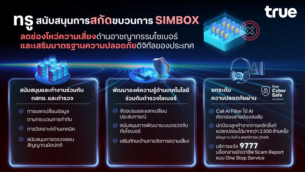 ทรู สนับสนุนกสทช. และตำรวจ ร่วมสกัดขบวนการ SIMBOX ลดช่องโหว่ความเสี่ยงด้านอาชญากรรมไซเบอร์ และเสริมมาตรฐานความปลอดภัยดิจิทัลของประเทศ