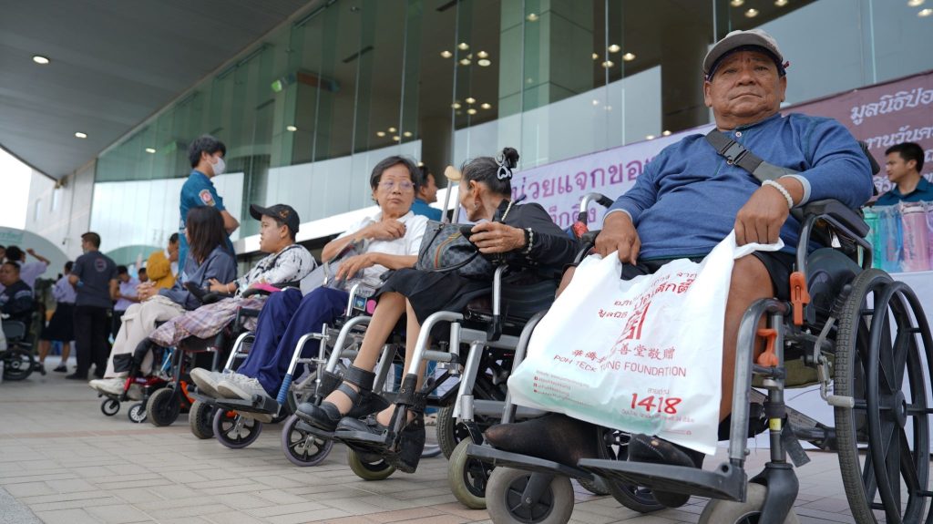 สำหรับการช่วยเหลือผู้พิการ มูลนิธิป่อเต็กตึ๊ง โดยฝ่ายสังคมสงเคราะห์ ได้ริเริ่มดำเนินการและขยายโครงการต่อเนื่องเรื่อยมา ด้วยความตระหนักถึงความยากลำบากในการดำรงชีวิต เพื่อการส่งเสริมและพัฒนาคุณภาพชีวิต อาทิ โครงการ “ป่อเต็กตึ๊ง สงเคราะห์สังคม” โดยการมอบเข็นวีลแชร์แก่ผู้พิการ พร้อมมอบค่าพาหนะสำหรับผู้ที่เดินทางมารับ ซึ่งขณะนี้ได้กระจายความช่วยเหลือไปสู่ผู้พิการยากไร้ในส่วนภูมิภาค นอกจากนี้ มูลนิธิฯ ยังให้ความช่วยเหลือโดยผ่าน หรือร่วมกับโครงการ องค์กร และหน่วยงานต่างๆ อาทิ การสนับสนุนค่าพาหนะ และเครื่องอุปโภคบริโภค ให้แก่ผู้รับขาเทียม ช่างและอาสาสมัคร ในโครงการออกหน่วยทำขาเทียมพระราชทานเคลื่อนที่ การมอบของขวัญเพื่อเป็นขวัญและกำลังใจแก่ผู้พิการ เนื่องในวันคนพิการ โดยร่วมกับสภาสังคมสงเคราะห์แห่งประเทศไทย ในพระบรมราชูปถัมภ์ และในวันจันทร์นี้ (10 พฤศจิกายน พ.ศ. 2568) มูลนิธิฯ กำหนดมอบไม้เท้าขาวแก่ผู้พิการทางสายตา ผ่านมูลนิธิช่วยคนตาบอดแห่งประเทศไทย ในพระบรมราชินูปถัมภ์ สมาคมคนตาบอดแห่งประเทศไทย และมูลนิธิธรรมิกชนเพื่อคนตาบอดในประเทศไทย ในพระบรมราชูปถัมภ์ รวมงบประมาณการช่วยเหลือผู้พิการ ในปี 2568 ณ ปัจจุบัน คิดเป็นมูลค่ากว่า 2 ล้านบาท