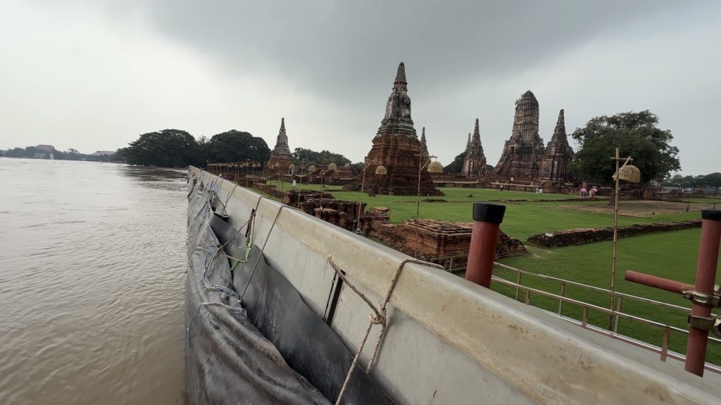 โดยพบว่าระดับน้ำในแม่เจ้าพระยา บริเวณ หน้าโบรามสถาน วัดไชยวัฒนาราม ในพื้นที่ ตำบลบ้านป้อม อำเภอพระนครศรีอยุธยา จังหวัดพระนครศรีอยุธยา ระดับน้ำ เพิ่มสูงขึ้นจากเมือวาน 10 ซม.โดยทาง อุทยานประวัติศาสตร์พระนครศรีอยุธยา ได้จัดเจ้าหน้าที่ ได้ติดตั้ง แผ่นเหล็ก ความสูงประมาณ 1 เมตร เสริมความสูง ของแนวบังเกอร์ ป้องกันน้ำท่วม สำเร็จรูป ความสูง 1.90 เมตร สูง ตลอดแนวริมแม่น้ำเจ้าพระยารวมระยะทาง 165 เมตร รวม 138 แผ่น พร้อมวางแผ่นผ้าใบ กระสอบทราย ที่ติดตั้งไว้ก่อนแล้ว