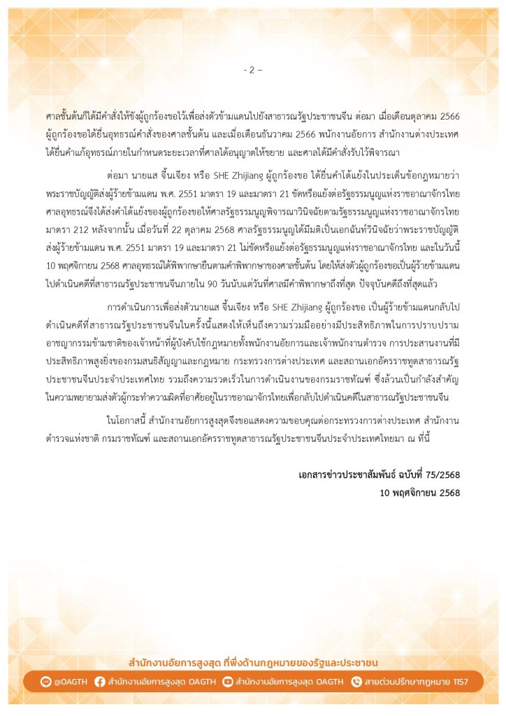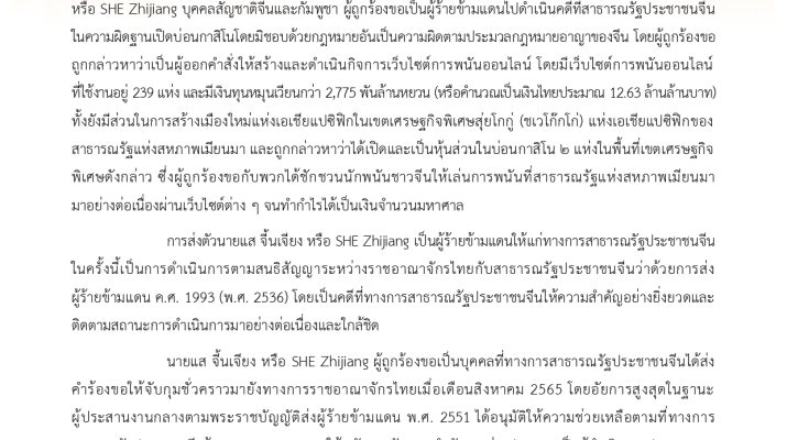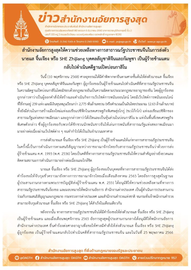วันนี้ 10 พฤศจิกายน 2568 ศาลอุทธรณ์ได้มีคำพิพากษายืนตามศาลชั้นต้นให้ส่งตัวนายแส จี้นเจียง หรือ SHE Zhijiang บุคคลสัญชาติจีนและกัมพูชา ผู้ถูกร้องขอเป็นผู้ร้ายข้ามแดนไปดำเนินคดีที่สาธารณรัฐประชาชนจีนในความผิดฐานเปิดบ่อนกาสิโนโดยมิชอบด้วยกฎหมายอันเป็นความผิดตามประมวลกฎหมายอาญาของจีน โดยผู้ถูกร้องขอถูกกล่าวหาว่าเป็นผู้ออกคำสั่งให้สร้างและดำเนินกิจการเว็บไซต์การพนันออนไลน์ โดยมีเว็บไซต์การพนันออนไลน์ที่ใช้งานอยู่ 239 แห่ง และมีเงินทุนหมุนเวียนกว่า 2,775 พันล้านหยวน (หรือคำนวณเป็นเงินไทยประมาณ 12.63 ล้านล้านบาท) ทั้งยังมีส่วนในการสร้างเมืองใหม่แห่งเอเชียแปซิฟิกในเขตเศรษฐกิจพิเศษสุ่ยโกกู่ (ชเวโก๊กโก่) แห่งเอเชียแปซิฟิกของสาธารณรัฐแห่งสหภาพเมียนมา และถูกกล่าวหาว่าได้เปิดและเป็นหุ้นส่วนในบ่อนกาสิโน ๒ แห่งในพื้นที่เขตเศรษฐกิจพิเศษดังกล่าว ซึ่งผู้ถูกร้องขอกับพวกได้ชักชวนนักพนันชาวจีนให้เล่นการพนันที่สาธารณรัฐแห่งสหภาพเมียนมามาอย่างต่อเนื่องผ่านเว็บไซต์ต่าง ๆ จนทำกำไรได้เป็นเงินจำนวนมหาศาล