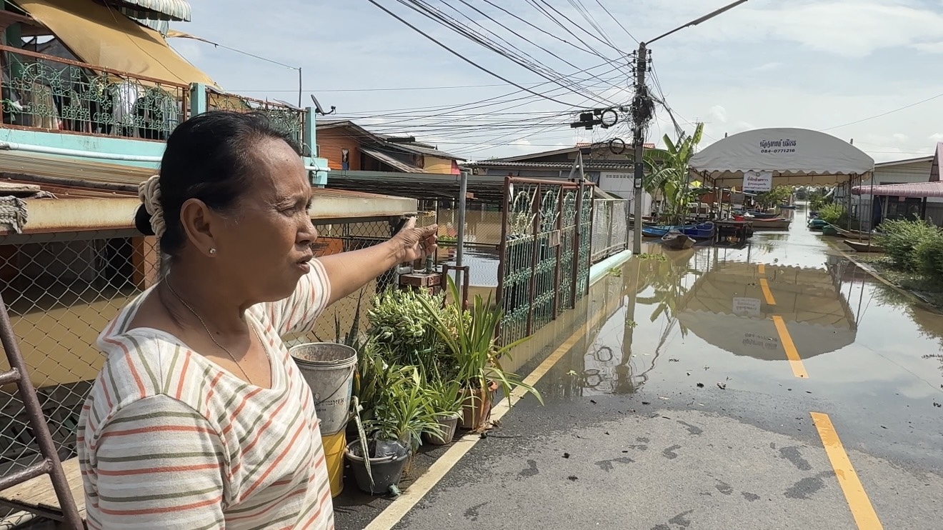 นาย พงศ์ศักดิ์ ศรีเจริญ อายุ 73 ปี น้ำท่วมนานตรงบ้าน 2 เดือนแล้ว ครั้งนี้ครั้งที่ 3 ขนาดตรงบ้านตรงเองสูงสุด ถ้าบ้านประชาชนด้านในริมแม่น้ำเจ้าพระยา ท่วมนาน 3 – 4 เดือน มิดหัวทุกหลัง ท่วมมานานแต่ก็ไม่ชินซะที ก็ไม่รู้จำอย่างไร ได้ 9,000 บาทแล้ว เขาให้เราก็เอา แต่บอกเลยไม่คุ้ม ให้ก็เอา ถ้าไม่เอาก็จะหาว่ายิ่ง
