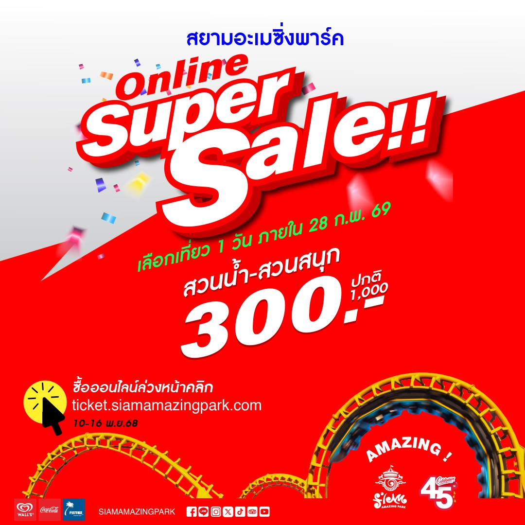 สยามอะเมซิ่งพาร์ค จัดหนักจัดเต็ม โปรโมชั่นพิเศษ Super Sale ในโอกาสครบ 45 ปี เที่ยวได้ทั้งสวนสนุกเครื่องเล่นระดับโลกมากมาย สวนน้ำ สุดอลังการ พร้อมเปิดตัวเครื่องเล่นใหม่กลางทะเล-กรุงเทพฯ Ranger’s Pirate Lagoon สนุกไม่อั้น ไม่จำกัดรอบทั้งวัน บัตรผู้ใหญ่ (130 ซม.ขึ้นไป) ในราคาพิเศษเพียง 300 บาท (จากปกติ 1,000 บาท) เลือกเที่ยววันใดก็ได้ภายใน 28 ก.พ.69 ช่องทางเดียวง่าย ๆ ซื้อออนไลน์ที่ ticket.siamamazingpark.com วันนี้ถึง 16 พ.ย. เท่านั้น