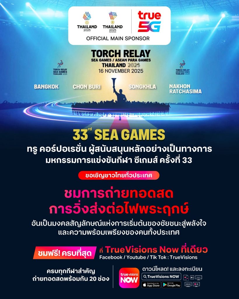 ทรู คอร์ปอเรชั่น ผู้สนับสนุนหลักอย่างเป็นทางการ ชวนชมฟรี! ผ่านแอปพลิเคชัน TrueVisions Now ซึ่งเป็นผู้คว้าสิทธิ์ถ่ายทอดสดซีเกมส์ แบบเอ็กซ์คลูซีฟ OTT รายเดียวในไทย รวมถึงช่องทางโซเชียลมีเดียของ TrueVisions Now ตั้งแต่เวลา 07.00 น. เป็นต้นไป ในวันอาทิตย์ที่ 16 พฤศจิกายน 2568 เพียงดาวน์โหลดแอปฯ และลงชื่อเข้าใช้ ก็สามารถรับชมไลฟ์พิธีวิ่งอัญเชิญไฟพระฤกษ์ได้ทุกที่ทุกเวลา ร่วมเก็บโมเมนต์แห่งความภาคภูมิใจของคนไทย ในฐานะเจ้าภาพมหกรรมกีฬาระดับภูมิภาคครั้งสำคัญของปี 2025 อย่างเต็มอรรถรส