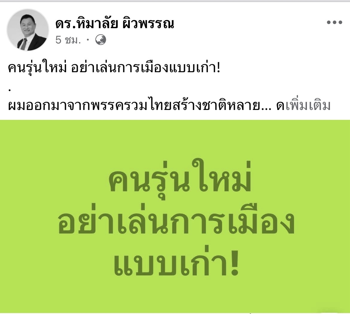 เมื่อวันทีี่ 22 พ.ย.68นายหิมาลัย ผิวพรรณ ที่ปรึกษาของรองนายกรัฐมนตรี ได้โพสต์ภาพ พร้อมข้อความลงบนเฟซบุ๊ก ระบุว่า คนรุ่นใหม่ อย่าเล่นการเมืองแบบเก่า!