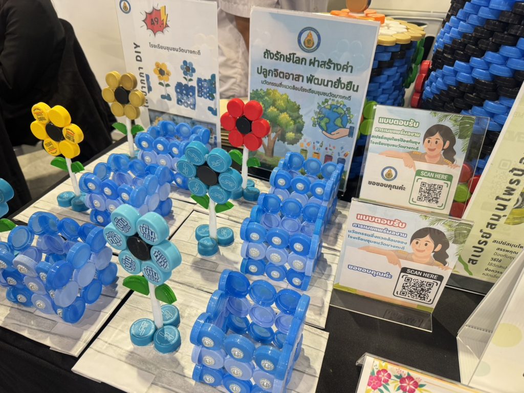 รวมถึง 4 โรงเรียนต้นแบบในพื้นที่ของศูนย์การค้าในเครือเอ็ม บี เค ไม่ว่าจะเป็น โรงเรียนวัดบรมนิวาส โรงเรียนแก่นทองอุปถัมภ์ โรงเรียนสุเหร่าใหม่ โรงเรียนชุมชนวัดบางกะดี ที่เข้าร่วมกิจกรรม “แยกขวด ช่วยน้อง” ภายใต้โครงการ ข.ขวดรักษ์โลก ของทางเอ็ม บี เค เพื่อเสริมความรู้เรื่องการคัดแยกขยะ การบริหารจัดการขยะ พร้อมนำขวดพลาสติกที่ได้จากการคัดแยกขยะไปทำเป็นกระเป๋านักเรียนอัพไซเคิล ตอบสนองเป้าลดก๊าซเรือนกระจกสุทธิเป็นศูนย์ มาร่วมกันเล่าถึงการต่อยอดถึงการคัดแยกขยะเพิ่มเติมจากขวดพลาสติก ด้วยการนำฝาขวดน้ำพลาสติกมาผลิตเป็นกระเป๋า ผลิตเป็นพวงกุญแจ ทำให้เด็ก ๆ ในโรงเรียนใช้เวลาว่างให้เป็นประโยชน์ มีรายได้เสริม รวมถึงการคัดแยกขยะจากเศษอาหาร ก็นำมาทำเป็นปุ๋ยหมัก อีกด้วย