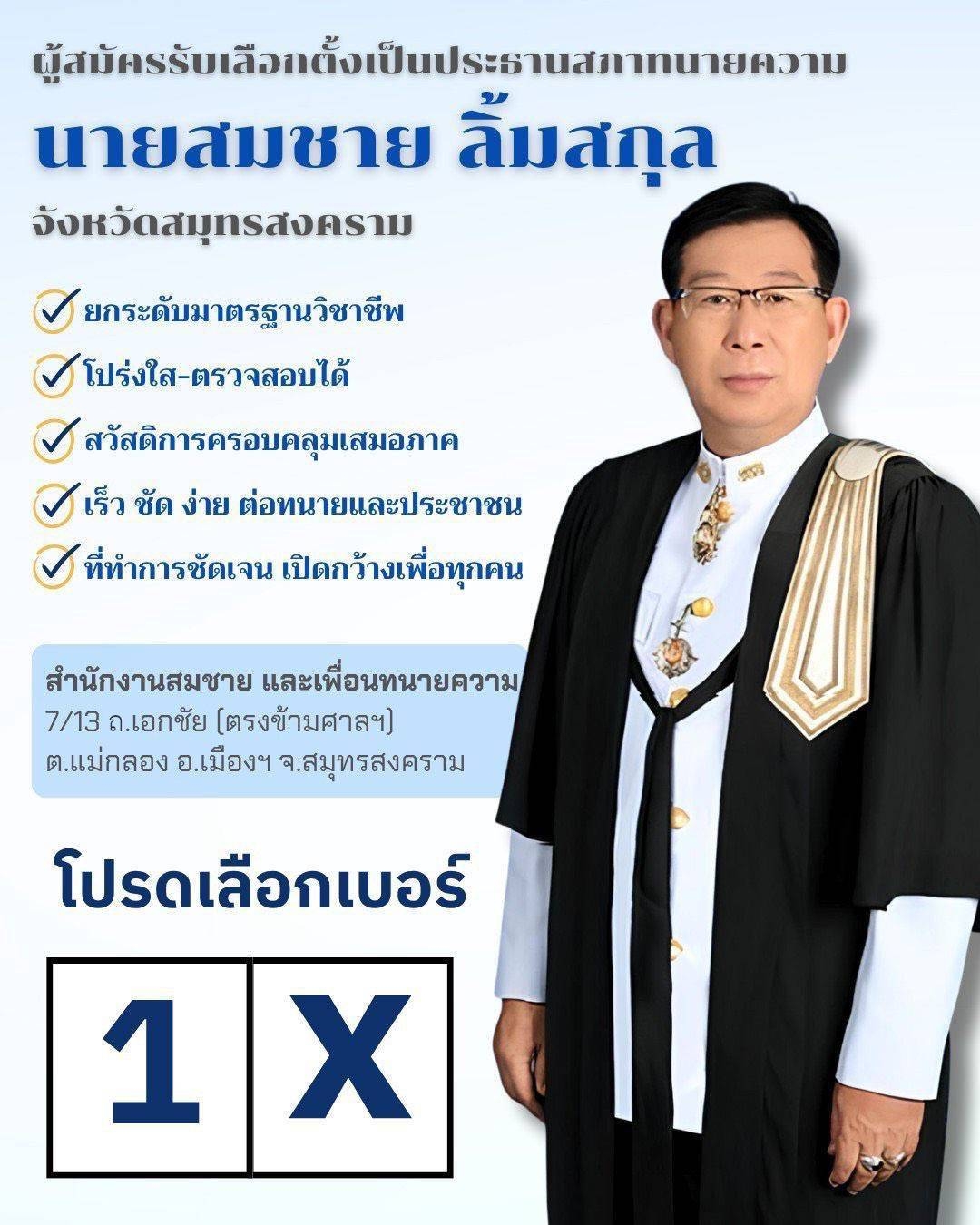 ขอแสดงความยินดีกับ นายสมชาย ลิ้มสกุล ในโอกาสได้รับเลือกตั้งให้ดำรงตำแหน่ง ประธานสภาทนายความจังหวัดสมุทรสงคราม สมัยที่ 5 (วาระปี 2568–2571)