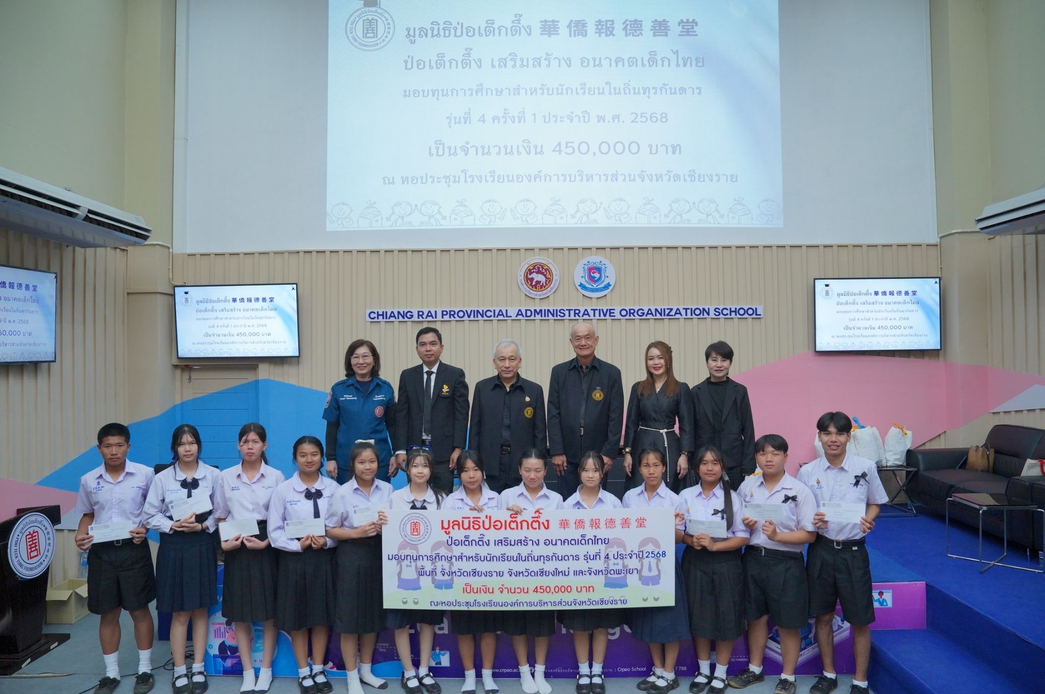 วานนี้ (วันจันทร์ที่ 24 พฤศจิกายน พ.ศ. 2568) มูลนิธิป่อเต็กตึ๊ง นำโดย นายสุรพงษ์ เตชะหรูวิจิตร กรรมการและรองเลขาธิการ พร้อมด้วย นายนิพนธ์ ลีละศิธร กรรมการ และนางสาวดวงชุตา ติยะพจนพรกุล ผู้ช่วยผู้จัดการฝ่ายสังคมสงเคราะห์ นำทีมแผนกส่งเสริมการศึกษาและอาชีพลงพื้นที่จังหวัดเชียงราย มอบทุนการศึกษาในระดับมัธยมศึกษาแก่นักเรียนในถิ่นทุรกันดาร รุ่นที่ 4 ครั้งที่ 1 ประจำปี 2568 ซึ่งเป็นการมอบทุนฯ ในรูปแบบต่อเนื่อง 3 ปี รวมจำนวน 60 ทุน รวมงบประมาณทั้งสิ้น 450,000 บาท (สี่แสนห้าหมื่นบาทถ้วน) โดยมี นายวีระยุทธ คีลาวงค์ รองผู้อำนวยการโรงเรียนองค์การบริหารส่วนจังหวัดเชียงราย พร้อมด้วยผู้บริหารสถานศึกษา อีก 20 แห่ง คณะครู อาจารย์ และผู้แทนนักเรียนจากโรงเรียน ร่วมในพิธี ณ หอประชุมโรงเรียนองค์การบริหารส่วนจังหวัดเชียงราย อำเภอเมือง จังหวัดเชียงราย