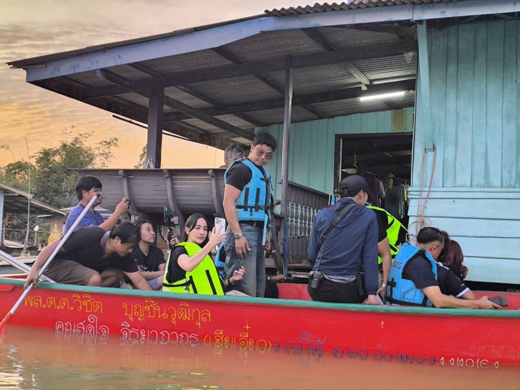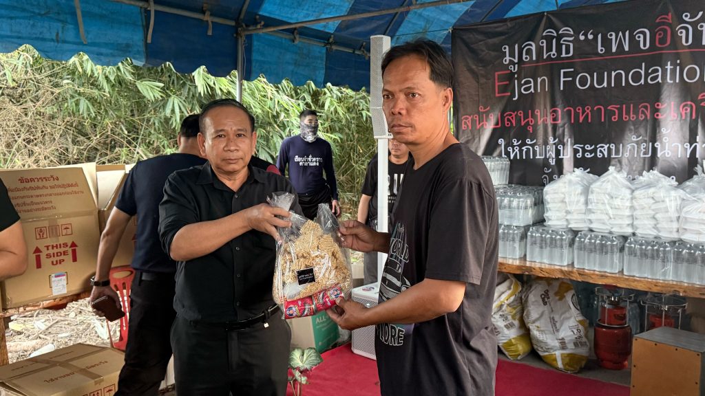 จากนั้นมูลนิธิอีจัน ได้นำศิลปิน และผู้ร่วมคณะนำสิ่งของ อาหาร และเครื่องใช้ที่จำเป็นที่ได้เตรียมมาส่งมอบให้กับตัวแทนของแต่ละครอบครัว โดยได้มีการลงเรือท้องแบน นำการช่วยเหลือไปส่งให้ถึงหน้าบ้านที่ยังคงจมแช่อยู่ในผืนน้ำ ที่ไม่มีไฟฟ้า น้ำปะปาใช้ ซึ่งเป็นส่วนหนึ่งจากหลายครั้งที่ได้มีการส่งต่อกำลังใจ ส่งความห่วงใจถึงพี่น้องคนไทยที่ไม่ทอดทิ้งกัน โดยพบว่านอกเหนือจากการไม่สะดวกสบายในการใช้ห้องน้ำ การประกอบอาหารรับประทาน ยังคงต้องมีการดูแลผู้ป่วยติดเตียงและผู้สูงวัยและเด็กอ่อน อยู่ในบ้านที่ขาดเครื่องอำนวยความสะดวกใดใด โดยจะมีการลงพื้นที่อย่างต่อเนื่องเพื่อประสานการร่วมมือในการแก้ปัญหาจนกว่าสถานการณ์จะคลี่คลาย