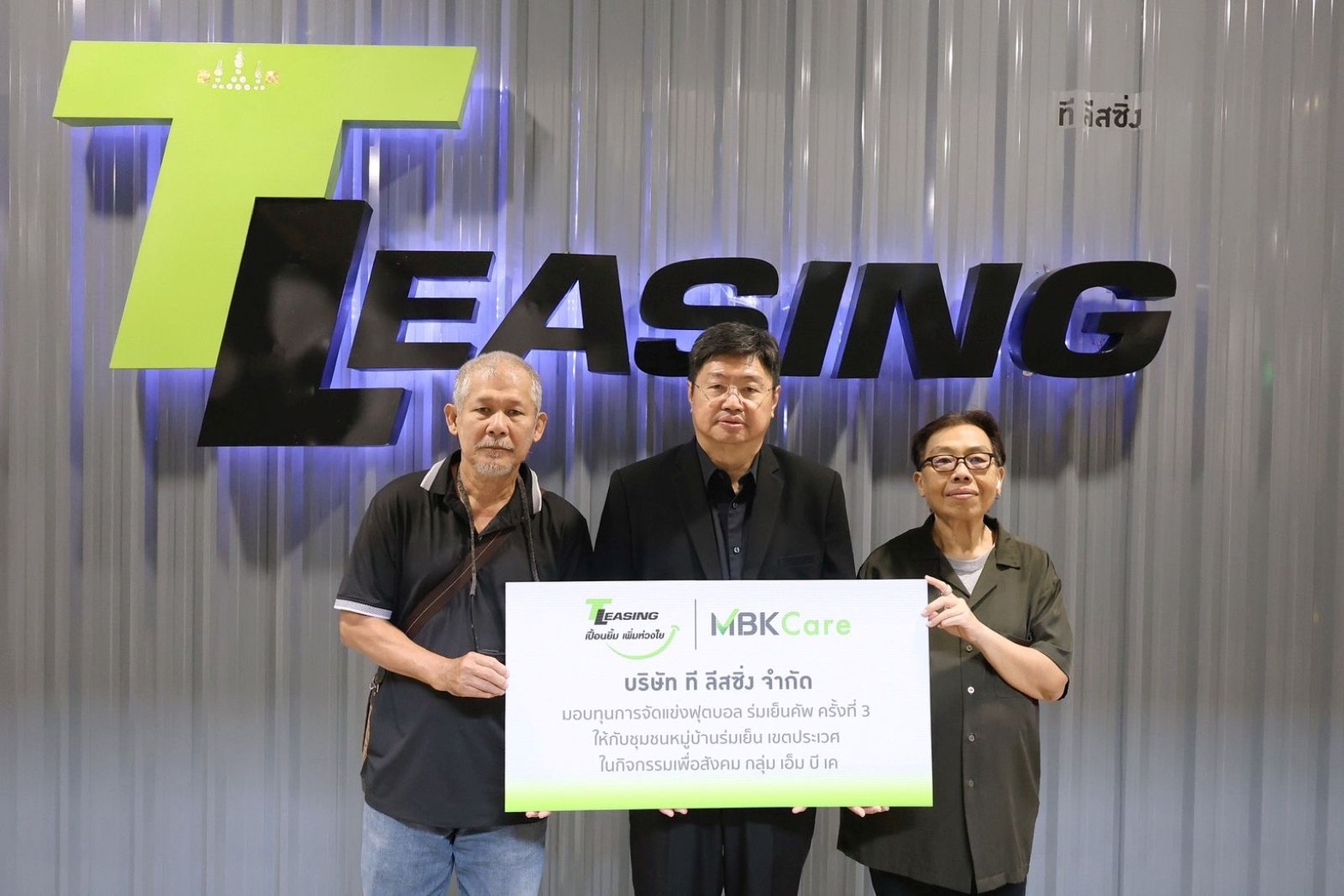 นายมงคล เพียรพิทักษ์กิจ กรรมการผู้จัดการ (ที่ 2 จากซ้าย) บริษัท ที ลีสซิ่ง จำกัด ผู้ให้บริการสินเชื่อเช่าซื้อรถจักรยานยนต์ ในเครือ เอ็ม บี เค มอบทุนสนับสนุนการแข่งขัน กีฬาฟุตบอล ร่มเย็นคัพ ครั้งที่ 3 กลุ่มเยาวชนอายุไม่เกิน 12 ปี เพื่อส่งเสริมการออกกำลังกาย การสร้างความสามัคคี และพัฒนาคุณภาพชีวิตที่ยั่งยืนให้ชาวชุมชนหมู่บ้านร่มเย็น เขตประเวศ ตามจุดมุ่งหมายของโครงการ ที ลีสซิ่ง เปื้อนยิ้ม เพิ่มห่วงใย เน้นการสนับสนุนกิจกรรมเพื่อสาธารณประโยชน์ และการยกระดับคุณภาพชีวิตของชุมชนอย่างทั่วถึง ซึ่งรายได้ทั้งหมดจากการแข่งขันมอบให้ศูนย์สุขภาพชุมชน โดยมีนายวันชัย เชื้อชุ่ม ที่ปรึกษาฟุตบอลชุมชนหมู่บ้านร่มเย็น Academy (ที่ 1 จากซ้าย) เป็นผู้รับมอบ ณ สำนักงานใหญ่ บริษัท ที ลีสซิ่ง จำกัด อาคารพาราไดซ์ เพลส ชั้น 3 เมื่อเร็วๆ นี้