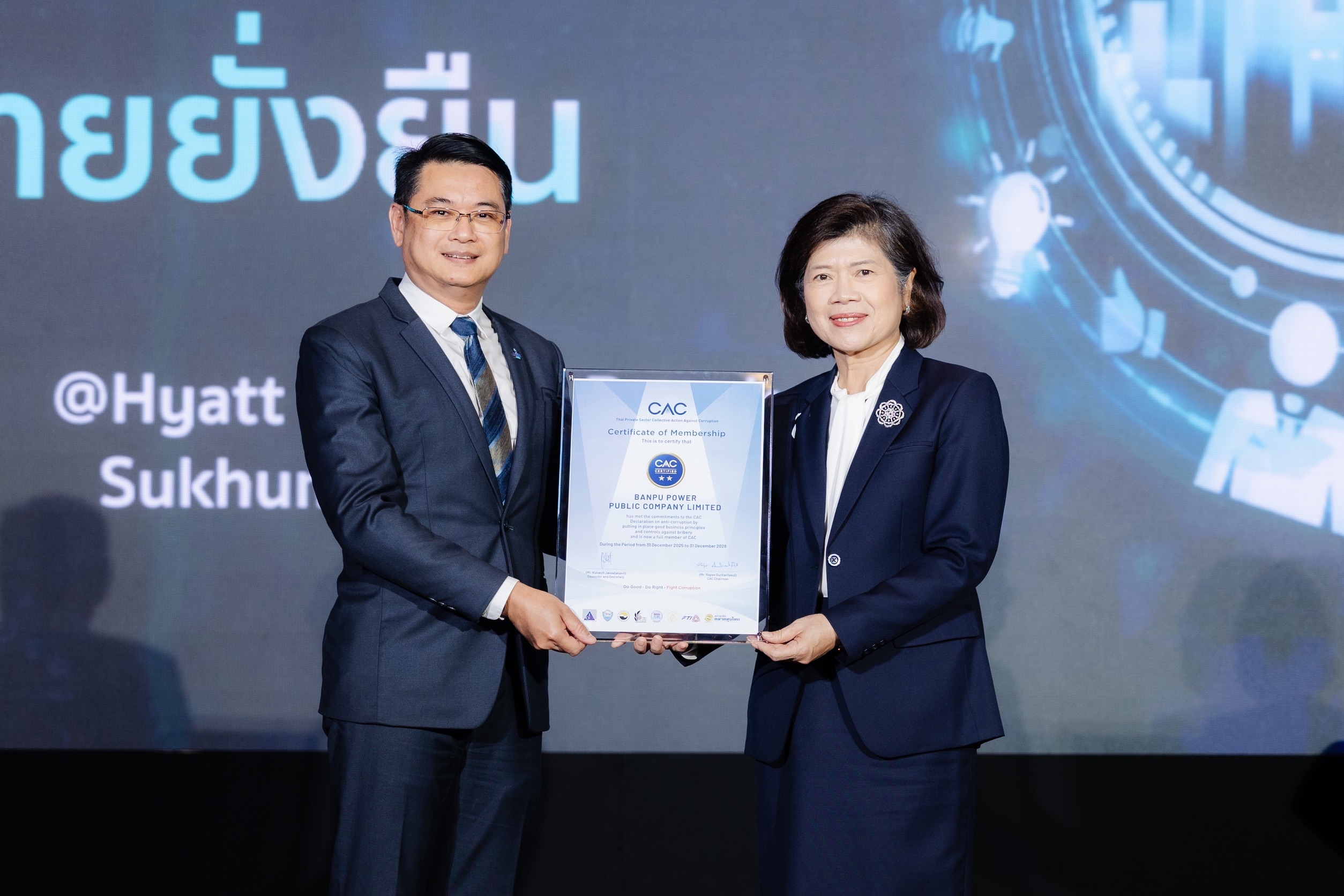 นายอิศรา นิโรภาส (ซ้าย) ประธานเจ้าหน้าที่บริหาร บริษัท บ้านปู เพาเวอร์ จำกัด (มหาชน) รับมอบประกาศนียบัตรรับรองการเป็นสมาชิกแนวร่วมต่อต้านคอร์รัปชันของภาคเอกชนไทย (Thai Private Sector Collective Action Against Corruption: CAC) จาก นางเกศรา มัญชุศรี กรรมการแนวร่วมต่อต้านคอร์รัปชันของภาคเอกชนไทย (ขวา)