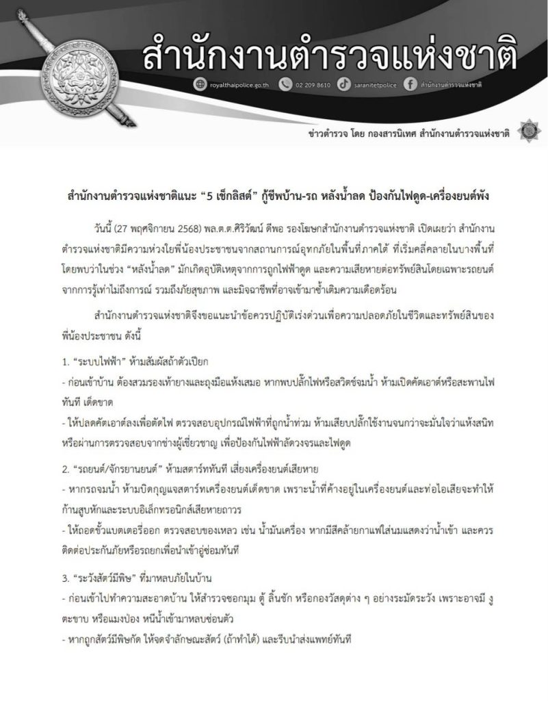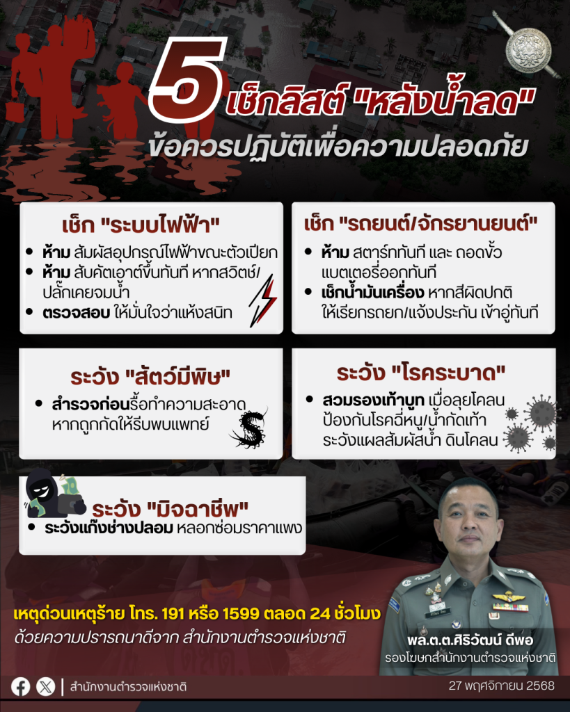 วันนี้ (27 พฤศจิกายน 2568) พล.ต.ต.ศิริวัฒน์ ดีพอ รองโฆษกสำนักงานตำรวจแห่งชาติ เปิดเผยว่า สำนักงานตำรวจแห่งชาติมีความห่วงใยพี่น้องประชาชนจากสถานการณ์อุทกภัยในพื้นที่ภาคใต้ ที่เริ่มคลี่คลายในบางพื้นที่ โดยพบว่าในช่วง “หลังน้ำลด” มักเกิดอุบัติเหตุจากการถูกไฟฟ้าดูด และความเสียหายต่อทรัพย์สินโดยเฉพาะรถยนต์จากการรู้เท่าไม่ถึงการณ์ รวมถึงภัยสุขภาพ และมิจฉาชีพที่อาจเข้ามาซ้ำเติมความเดือดร้อน