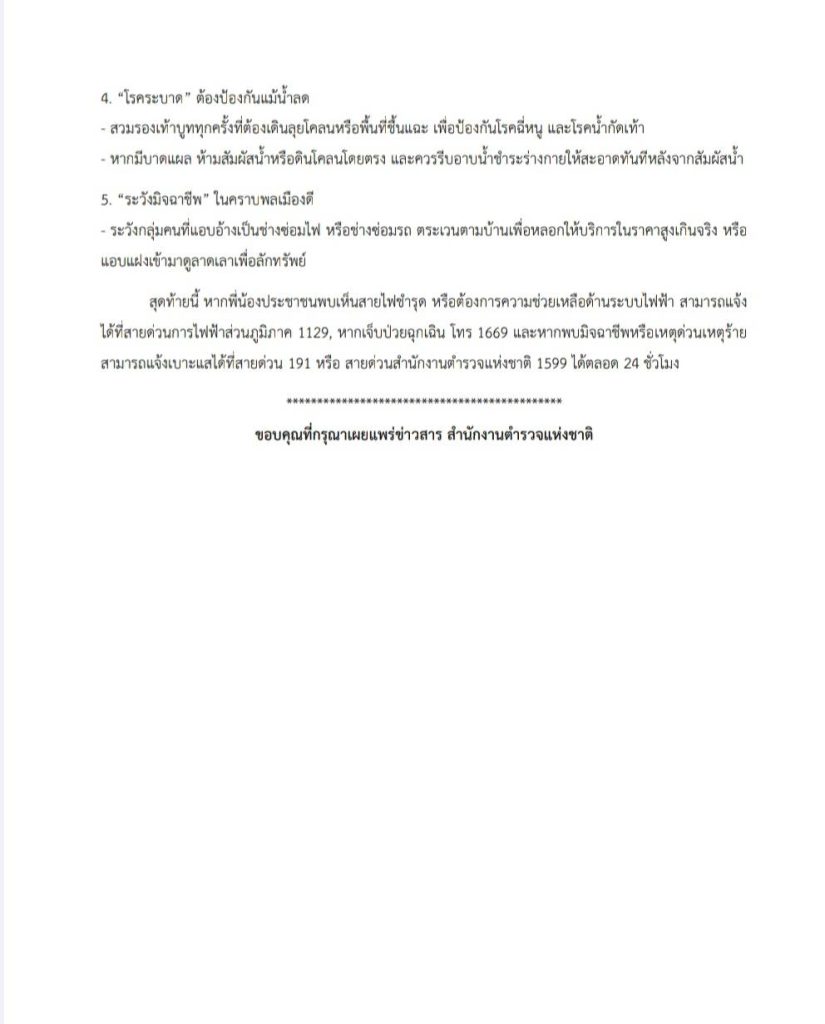 สุดท้ายนี้ หากพี่น้องประชาชนพบเห็นสายไฟชำรุด หรือต้องการความช่วยเหลือด้านระบบไฟฟ้า สามารถแจ้งได้ที่สายด่วนการไฟฟ้าส่วนภูมิภาค 1129, หากเจ็บป่วยฉุกเฉิน โทร 1669 และหากพบมิจฉาชีพหรือเหตุด่วนเหตุร้าย สามารถแจ้งเบาะแสได้ที่สายด่วน 191 หรือ สายด่วนสำนักงานตำรวจแห่งชาติ 1599 ได้ตลอด 24 ชั่วโมง