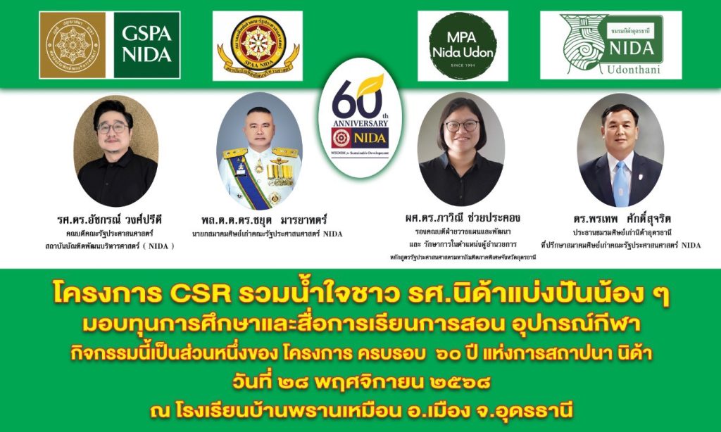 รศ.ดร.อัชกรณ์ กล่าว่าโครงการ CSR ดังกล่าวเป็นส่วนหนึ่งของกิจกรรมเนื่องในโอกาสครบรอบ 60 ปี สถาปนาสถาบันบัณฑิตพัฒน บริหารศาสตร์ ซึ่งเป็นความร่วมมือร่วมใจกันของคณะ รศ. สมาคมศิษย์เก่าคณะรศ. หลักสูตรรัฐประศาสนศาสตรมหาบัณฑิต จ.อุดรธานี และชมรมศิษย์เก่านิด้าอุดรธานี และ นศ.MPA รุ่น 31-32 จ.อุดรธานี เข้าร่วมโครงการ โดยมีวัตถุประสงค์เพื่อแสดงความรับผิดชอบต่อสังคม ตลอดจนสร้างประโยชน์และพัฒนาคุณภาพชีวิตให้แก่ชุมชน สังคมและสิ่งแวดล้อม กิจกรรมประกอบด้วยการมอบทุนการศึกษา อุปกรณ์กีฬาและยาสามัญประจำโรงเรียน เพื่อเป็นการแบ่งปันและช่วยเหลือนักเรียนที่ขาดแคลนทุนทรัพย์ และยังมีการปลูกต้นไม้เพื่อเป็นการลดมลพิษและรักษาสิ่งแวดล้อมอีกด้วย