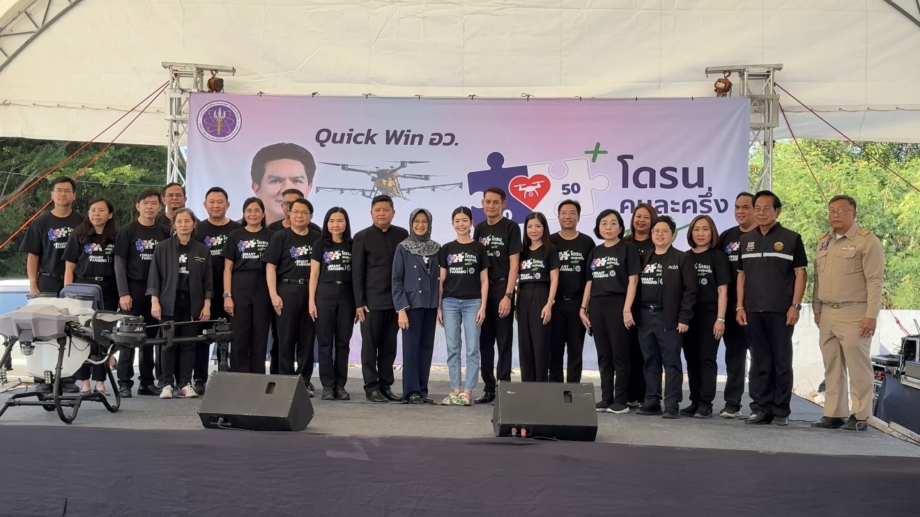 จากนั้น นายสุรศักดิ์ ได้มอบหมายให้ นายพิษณุ พลธี ที่ปรึกษา รมว.กระทรวง อว. พญ.เพชรดาว โต๊ะมีนา ผู้ช่วย รมต.กระทรวง อว. น.ส.พิมพ์พร ชีวานันท์ เลขานุการ รมว.กระทรวง อว.ร่วมกันกล่าวเปิดงาน โดยนายพิษณุ กล่าวว่า “ โดรนคนละครึ่งพลัส สู่สมาร์ทฟาร์มมิ่ง ” เป็นโครงการสำคัญของกระทรวง อว. ซึ่งจะเป็นประโยชน์กับเกษตรกรและพี่น้องประชาชนโดยตรง เพื่อยกระดับคุณภาพชีวิตเกษตรกร เพิ่มประสิทธิภาพเพิ่มรายได้และลดต้นทุนการผลิต ทั้งยังช่วยประหยัดเวลาและแรงงานในการทำงาน เช่น การฉีดพ่นสารเคมี, การให้ปุ๋ย, หรือการหว่านเมล็ด ที่สำคัญเป็นการลดการใช้สารเคมีและปุ๋ยเนื่องจากการควบคุมที่แม่นยำ ทำให้สามารถประเมินและจัดการการใช้ได้อย่างคุ้มค่ามากขึ้น ส่งผลให้คุณภาพและปริมาณของผลผลิตเพิ่มขึ้นและสามารถเข้าถึงพื้นที่เพาะปลูกที่ยากลำบาก เช่น พื้นที่ลาดชันหรือมีอุปสรรค ที่สำคัญเหนือสิ่งอื่นใดโครงการนี้จะช่วยลดความเสี่ยงด้านสุขภาพ เพราะเกษตรกรไม่ต้องสัมผัสสารเคมีโดยตรง ทำให้ลดความเสี่ยงในการเกิดปัญหาสุขภาพระยะยาว เช่น มะเร็ง หรืออาการแพ้ต่างๆ