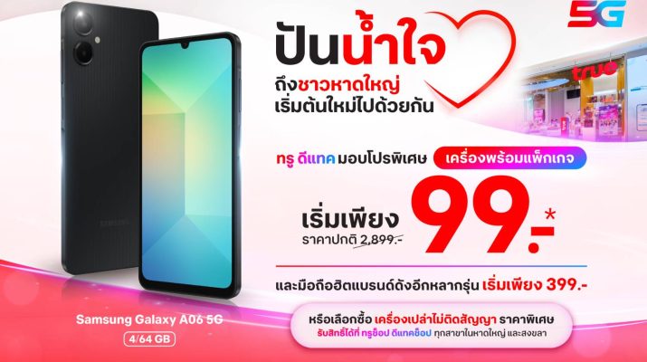 - Samsung Galaxy A06 5G เริ่มเพียง 99 บาท (ปกติ 2,899 บาท) พร้อมแพ็กเกจรายเดือน 599 บาท สำหรับลูกค้าทรูดีแทครายเดือนที่มีอายุการใช้งานตั้งแต่ 1 ปีขึ้นไป