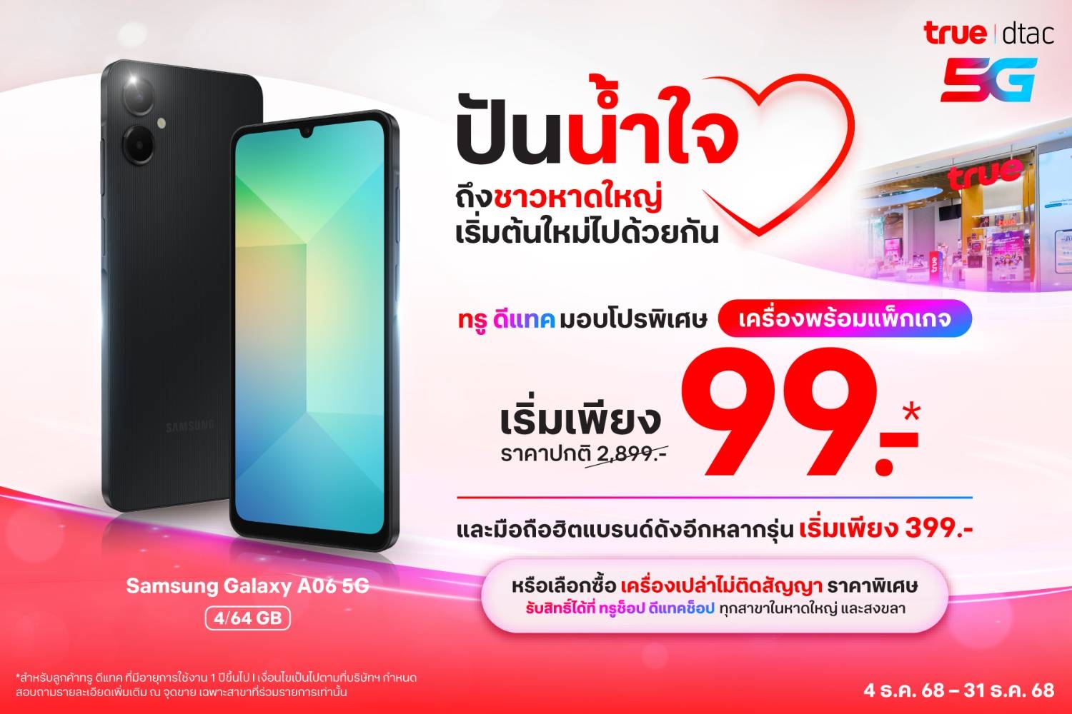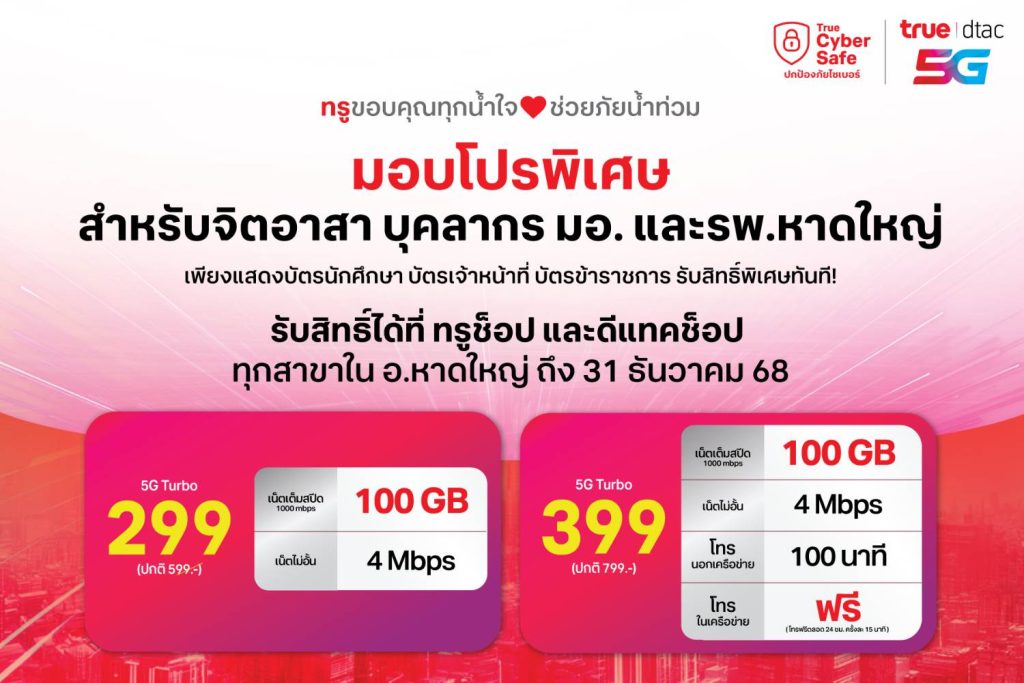 น้ำท่วมจากไป น้ำใจคงอยู่…..ทรู–ดีแทค พร้อมดูแลชาวหาดใหญ่–สงขลา ด้วยสมาร์ทโฟนราคาพิเศษเริ่มเพียง 99 บาท หรือ แพ็กเกจรายเดือนลด 50% รับสิทธิ์ได้ตั้งแต่วันนี้ถึงสิ้นปี 68