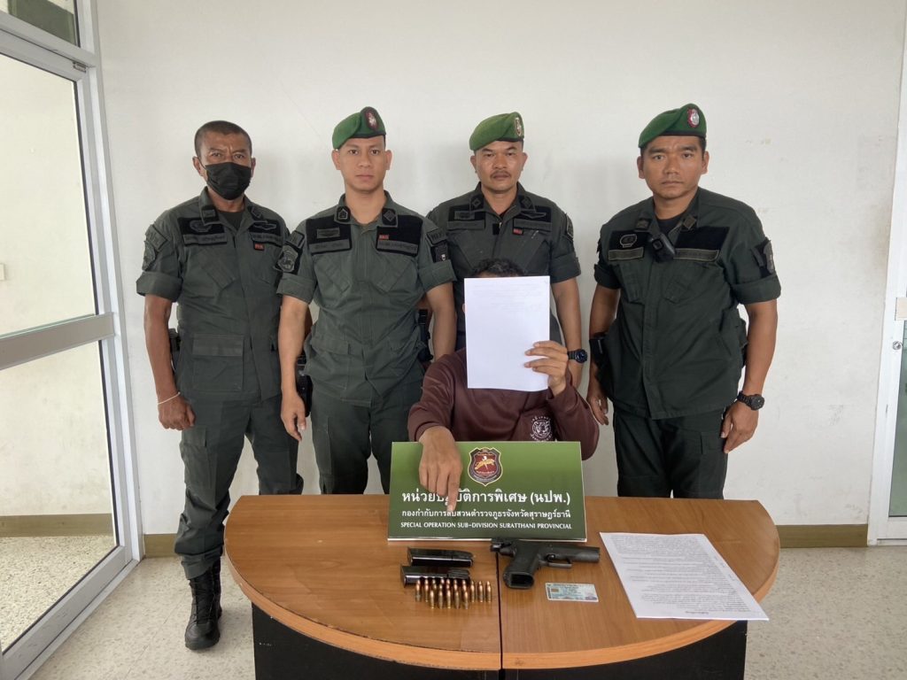และนอกจากนี้ได้นำกำลังออกตรวจและตั้งจุดสกัด ตามคำสั่งห้วงระดมกวาดล้างอาชญากรรมก่อนการเลือกตั้งสมาชิกองค์การบริหารส่วนตำบลเพื่อจับกุมความผิด พรบ.อาวุธปืน พรบ.ยาเสพติด บุคคลตามหมายจับเพื่อสร้างความเชื่อมั่นและความศรัทธาให้แก่ประชาชนและนักท่องเที่ยวและป้องกันปราบปรามอาชญากรรมพื้นที่ สภ.กาญจนดิษฐ์ ได้ร่วมกันจับกุมตัวนายรังสรรค์ เรืองศรี อายุ 60 ปี อยู่บ้านเลขที่ 200/265 ม.3 ต.คลองสวนพลู อ. พระนครศรีอยุธยา จ.พระนครศรีอยุธยา พร้อมด้วยของกลาง อาวุธปืนพกสั้นกึ่งอัตโนมัติ ขนาด 9 มม. จำนวน 1 กระบอก เครื่องกระสุนปืน ขนาด 9 มม. จำนวน 25 นัด แม็กกาซีน 9 มม. จำนวน 2 แม็ก ที่บริเวณบนถนนสายวังไทร-ม่วงลีบ ม.1 ต.คลองสระ อ.กาญจนดิษฐ์ จ.สุราษฎร์ธานี นำตัวส่งพนักงานสอบสวน สภ.เวียงสระดำเนินคดีข้อหา “พาอาวุธปืนไปในเมือง หมู่บ้าน ทางสาธารณะโดยไม่ได้รับอนุญาตและไม่มีเหตุอันควร ”