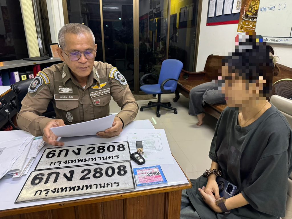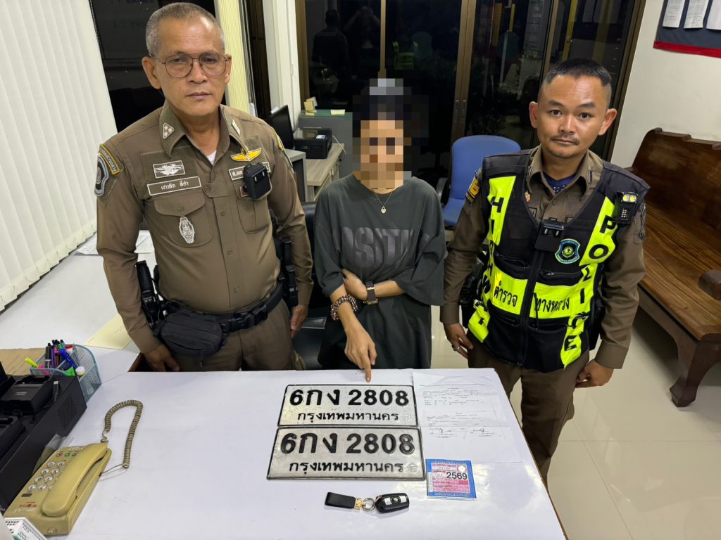 พบ น.ส.ปามิกา อายุ 32 ปี ชาวอำเภอเมืองสุพรรณบุรี จังหวัดสุพรรณบุรี เป็นผู้ขับขี่ เจ้าหน้าที่ตำรวจขอดูใบอนุญาตขับขี่,แผ่นป้ายแสดงการเสียภาษีประจำปี,แผ่นป้ายหมายเลขทะเบียน 6 กง 2808 กรุงเทพมหานคร ปรากฏว่ามีใบอนุญาตขับขี่ถูกต้องและมีแผ่นป้ายแสดงการเสียภาษีประจำปี หมายเลขทะเบียน 6 กง 2808 กรุงเทพมหานคร วันสิ้นอายุภาษี 7 เม.ย.2569 จำนวน 1 แผ่น ติดอยู่ที่กระจกบานหน้าฝั่งซ้ายมือของผู้ขับขี่ และมีแผ่นป้ายหมายเลขทะเบียน 6 กง 2808 กรุงเทพมหานคร จำนวน 2 แผ่นติดอยู่ที่กรอบป้ายทะเบียนด้านหน้ารถและติดอยู่ที่กรอบป้ายทะเบียนด้านท้ายรถยนต์ดังกล่าว