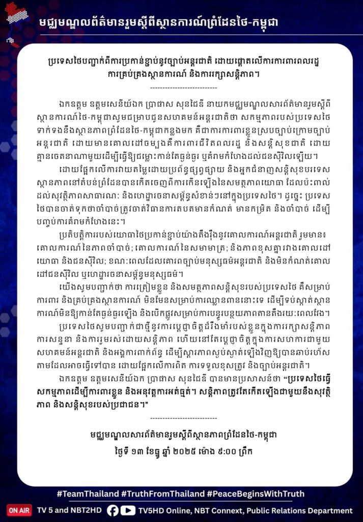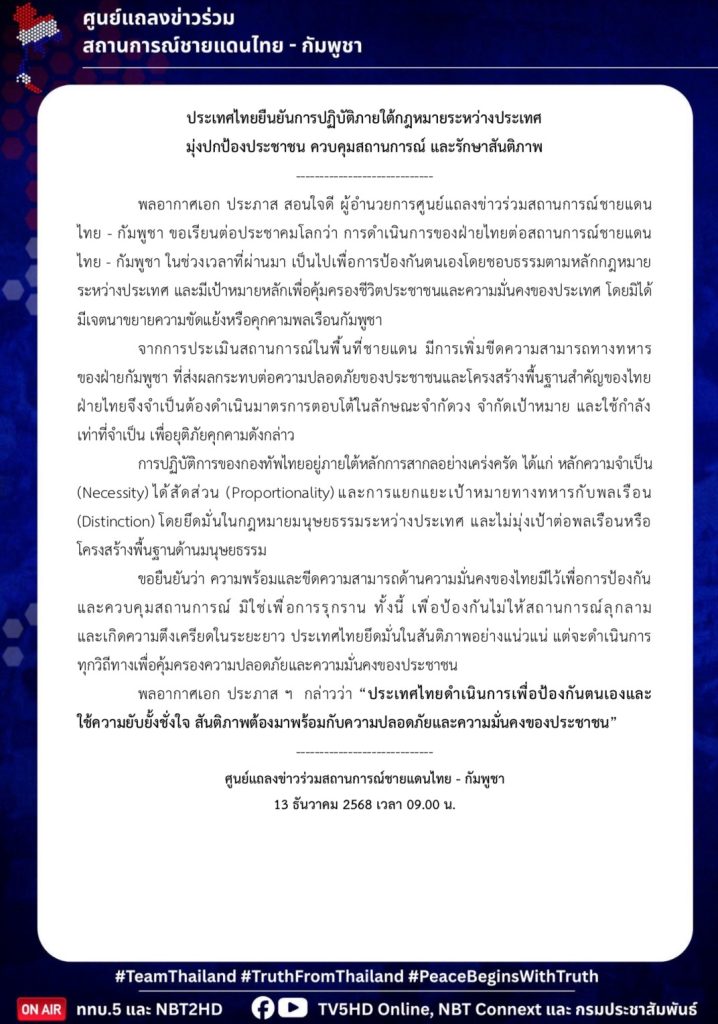 ศูนย์แถลงข่าวร่วม สถานการณ์ชายแดนไทย – กัมพูชา ประเทศไทยยืนยันการปฏิบัติภายใต้กฎหมายระหว่างประเทศ มุ่งปกป้องประชาชน ควบคุมสถานการณ์ และรักษาสันติภาพ ย้ำ เพื่อคุ้มครองชีวิตประชาชนและความมันคงของประเทศ