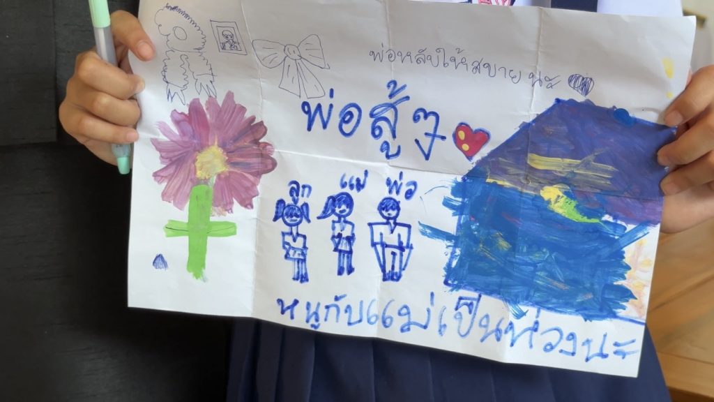 ลูกสาวน้องตั้งใจวาดภาพ เพื่อให้กำลังใจพ่อ สู้ สู้ หนูกับแม่เป็นห่วงนะ ยังไม่ได้ส่งให้พ่อดูต้องมาเปลี่ยนข้อความที่ภาพ เป็นบอกพ่อหลับให้สบายนะ น้องเขียนที่วัดเพื่อสื่อสารกับพ่อ