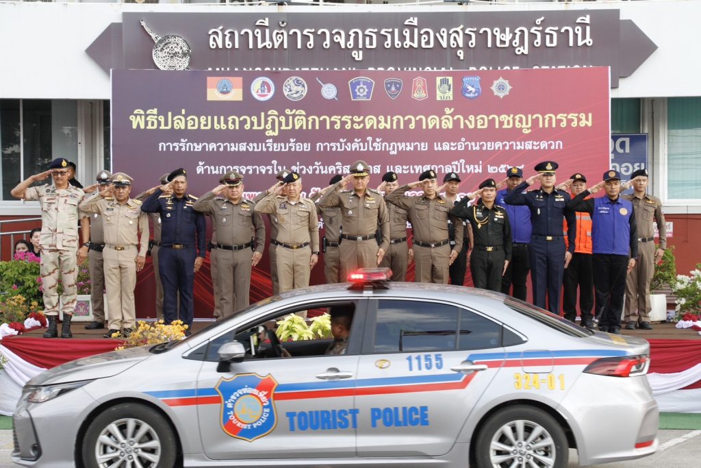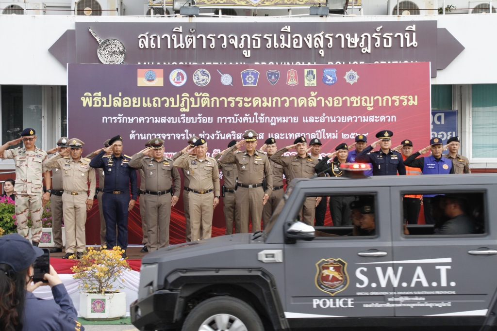 เมื่อเวลา 16.00 น.วันที่ 17 ธ.ค.68 ที่สถานีตำรวจภูธรเมืองสุราษฎร์ธานี พล.ต.ต.ธรรมนูญ ประยืนยง รอง ผบช.ภ.8 นายบันดาล สถิรชวาล รองผู้ว่าราชการจังหวัดสุราษฎร์ธานี นายสุเชาว์ ทูโมสิก นายอำเภอเมือง พ.ต.อ.ศิรชัย เกิดศรี รอง ผบก.ภ.จว.สุราษฎร์ธานี พ.ต.อ.พรณรงค์ การอรชัย ผกก.สภ.เมืองสุราษฎร์ธานี ร่วมปล่อยแถวระดมกวาดล้างอาชญากรรมช่วงวันคริสต์มาส และวันหยุดยาวเทศกาลปีใหม่ 2569 ระหว่างวันที่ 17-25 ธ.ค.68 โดยมีเจ้าหน้าที่ตำรวจในสังกัด,เจ้าหน้าที่ฝ่ายทหาร,ฝ่ายปกครอง,ปปส.ภ.8,ผู้แทนส่วนราชการ,หน่วยงานที่เกี่ยวข้อง,อาสมัคร,หน่วยกู้ภัย มูลนิธิเข้าร่วมกว่า 200 นาย