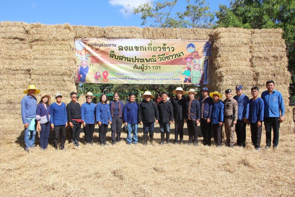 วันที่ 17 ธันวาคม 2568 เวลา 10.15 น. ณ แปลงนาสามัคคี บ้านท่าม่วง หมู่ที่ 3 ตำบลโพนสูง อำเภอปทุมรัตต์ จังหวัดร้อยเอ็ด นายชัชวาลย์ เบญจสิริวงศ์ ผู้ว่าราชการจังหวัดร้อยเอ็ด เปิดงาน “ลงแขกเกี่ยวข้าว สืบสานประเพณี วิถีชาวนา” โดยมีนายมงคล ยี่รัมย์ เกษตรจังหวัดร้อยเอ็ด พร้อมด้วยหัวหน้าส่วนราชการ นายอำเภอปทุมรัตต์ ผู้นำท้องที่/ท้องถิ่น และพี่น้องประชาชน เข้าร่วม เพื่อสืบทอดภูมิปัญญาท้องถิ่น ส่งเสริมความร่วมมือในชุมชน