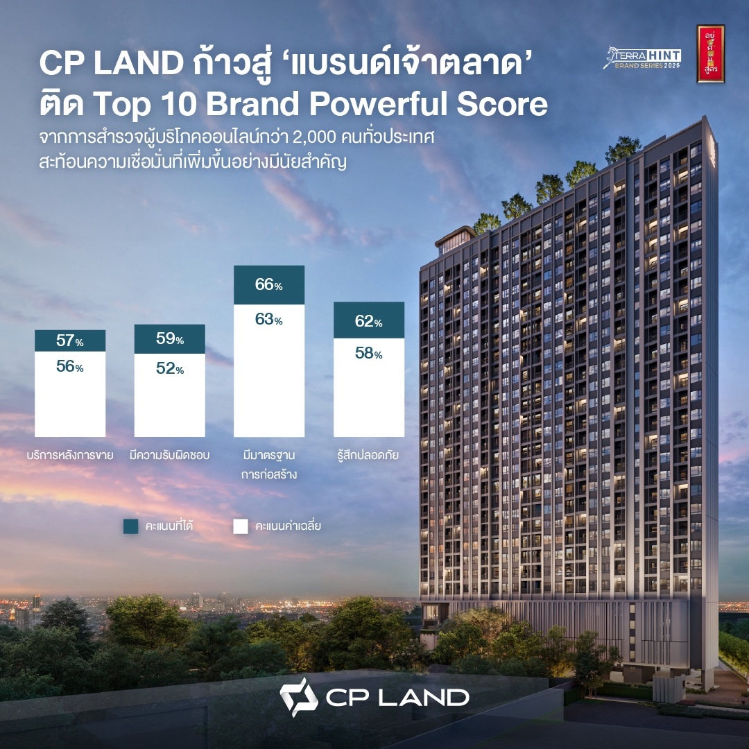 ในเวทีเดียวกัน บริษัท ซี.พี.แลนด์ จำกัด (มหาชน) หรือ CP LAND หนึ่งในผู้พัฒนาอสังหาริมทรัพย์ชั้นนำของไทย ถูกจัดอยู่ในกลุ่ม Top 10 Brand Powerful Score และขยับสถานะจาก “แบรนด์ผู้ท้าชิง” ขึ้นสู่กลุ่ม “แบรนด์เจ้าตลาด (Market Leader Brand) สะท้อนว่าบ้านและโครงการของ CP LAND กำลัง “ตรงใจ” ผู้บริโภคมากขึ้นอย่างมีนัยสำคัญ